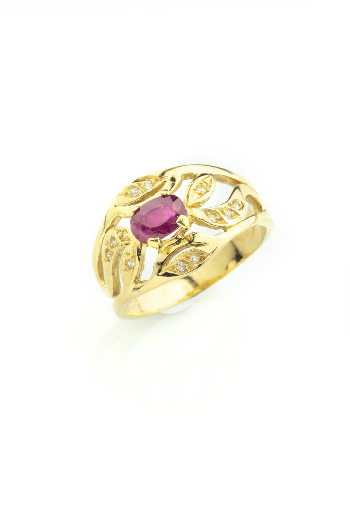 -Anello in oro giallo con al centro un rubino taglio ovale di ct 0,40 ca; piccoli diamanti a decoro. Peso gr 4.4. Misura16