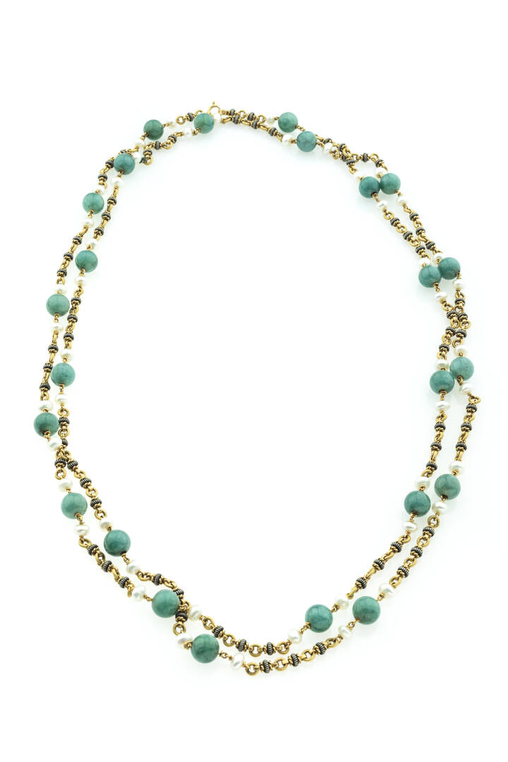 composta da anelli in oro giallo 14 Kt e argento, alternati a sfere di avventurina e perline