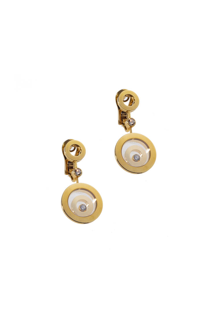 Coppia di orecchini pendenti in oro giallo, firmati "Chopard", linea "Happy Diamond"; diamanti taglio brillante per totali ct 0,30 ca, probabile colore G-H, purezza IF-VVS