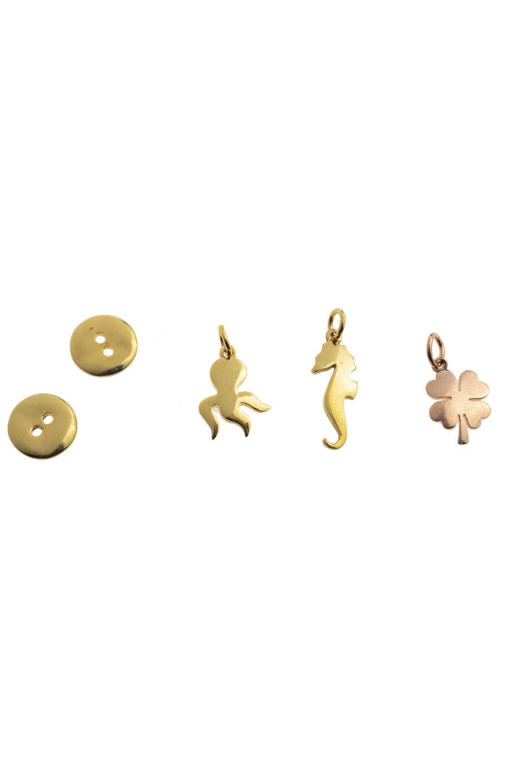 Lotto di cinque ciondoli in oro giallo firmati "Pomellato", linea "Dodo" raffiguranti: un polipo, un cavalluccio marino, un quadrifoglio in oro rosa 9 Kt ed due bottoni