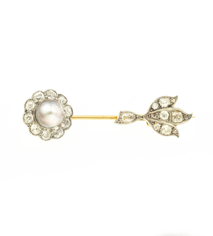 in oro giallo e bianco, anni '30, con diamanti taglio brillante di vecchio taglio per totali ct 1,30 ca e una perla grigia del diam di 7,5 mm