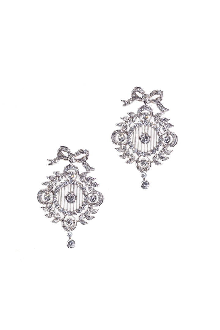 pendenti, in oro bianco, fiocchi ai lobi, corpo con elemento centrale lavorato a rete e impreziosito da volute in diamanti taglio brillante di vecchio taglio per totali ct 1,10 ca