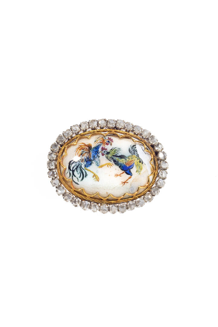 in oro rosa e bianco, di forma ovale, con miniatura smaltata raffigurante un combattimento di galli (mancanza); contornata da rosette di diamanti per totali ct 0,70 ca