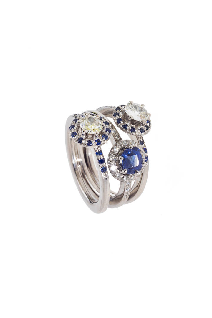 in oro bianco, composto da tre file, con diamanti di vecchio taglio per totali ct 1,0 ca e zaffiri taglio quadro e rotondo per totali ct 1,20 ca