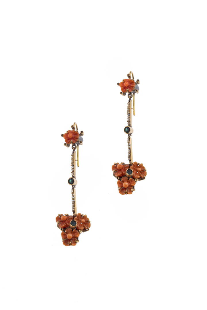 pendenti, XIX secolo, borbonici, in oro a bassa caratura, con fiori e piccole perline (alcune mancanti)