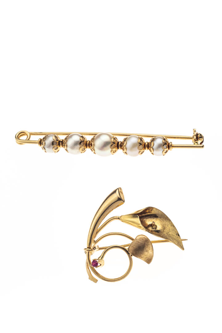 in oro giallo: una a barretta, con cinque perle giapponesi del diam7,6 e 6 ca, peso gr 6,4; la seconda a forma di voluta con rubino sintetico, peso gr 3,6