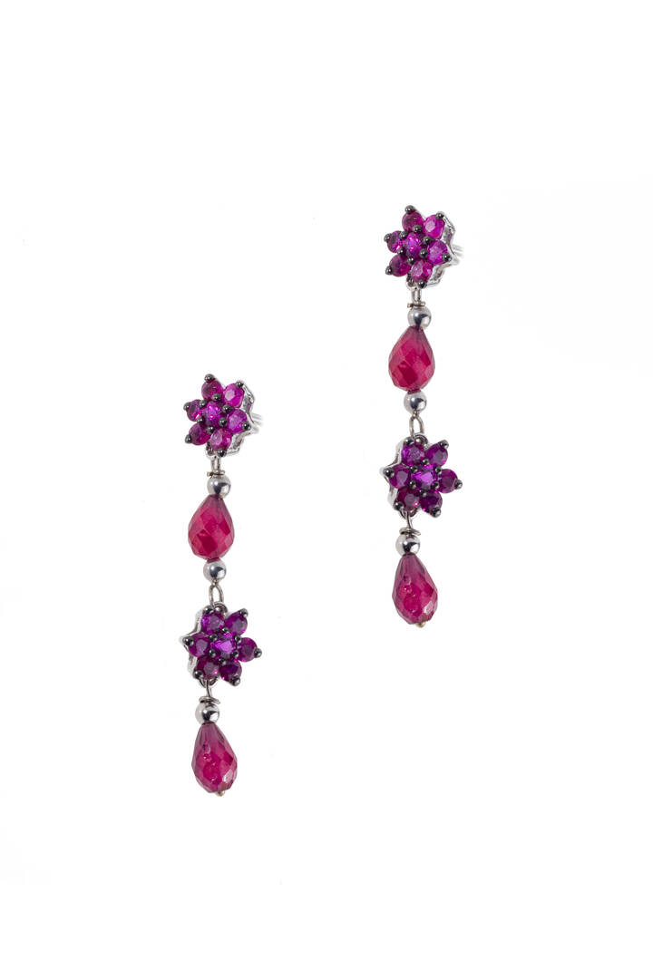 pendenti, in oro bianco con fiori in rubini taglio rotondo e gocce briolette per totali ct 3,0 ca