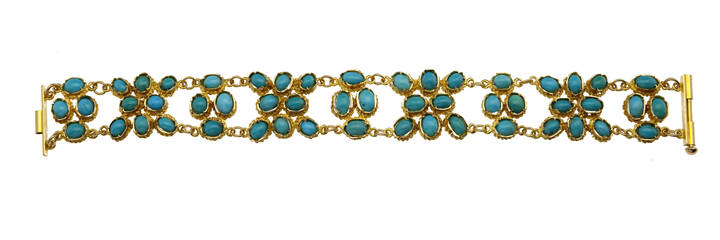in oro giallo 14 Kt con turchesi cabochon taglio ovale disposti a motivo geometrico