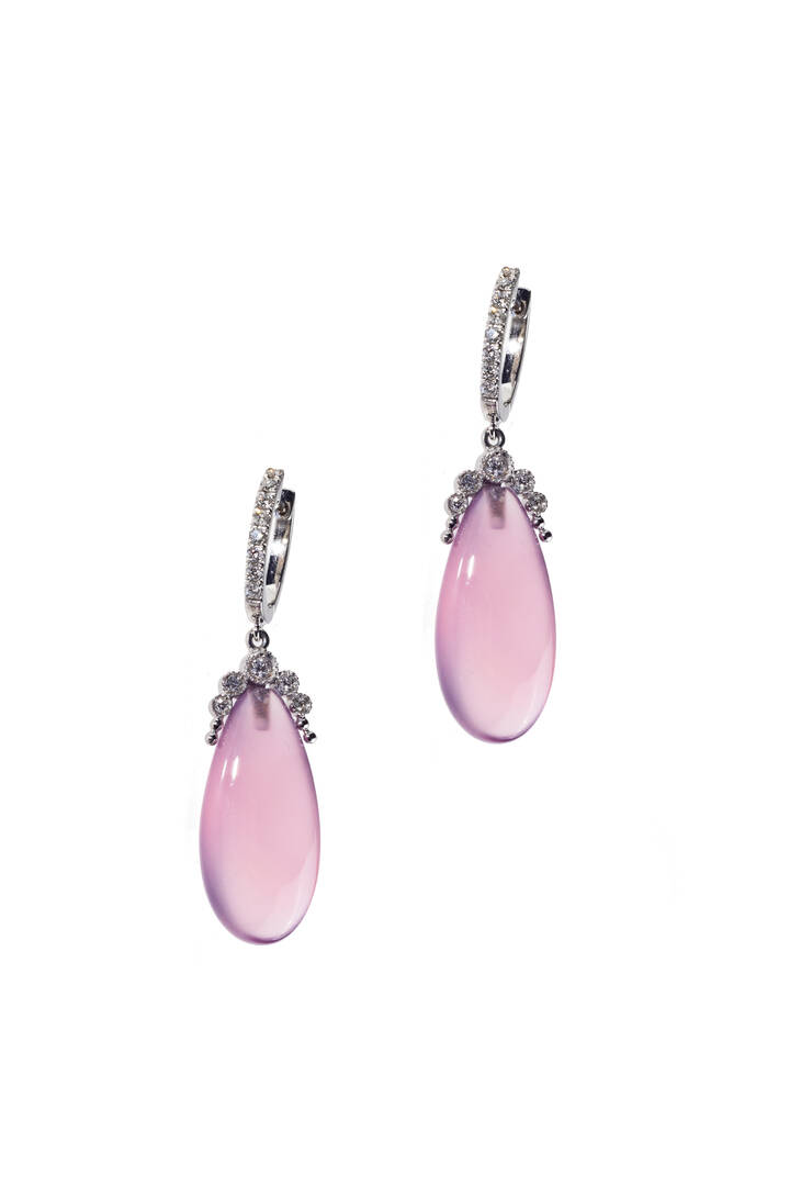 pendenti in oro bianco con gocce di quarzo rosa cabochon; diamanti taglio brillante per totali ct 0,46 ca