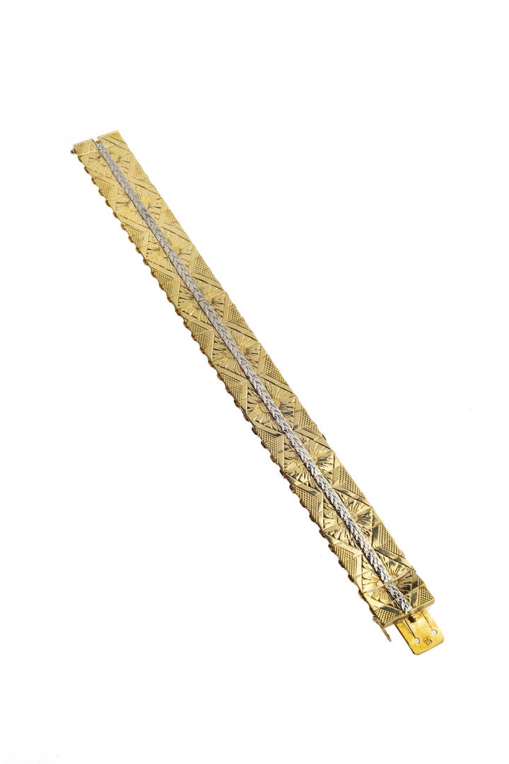 in oro giallo e bianco, composto da segmenti rigidi incisi a motivi geometrici e floreali