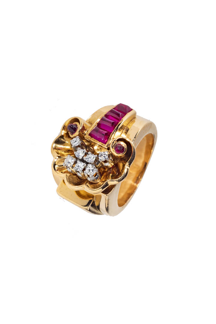 in oro rosa, anni '40, con sommità a conchiglia con diamanti taglio brillante per totali ct 0,20 ca e rubini taglio baguette sintetici