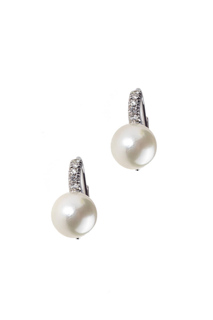 in oro bianco, a monachella, con due perle australiane del diam di mm 10,7 ca, sormontate da diamanti taglio brillante per totali ct 0,18 ca
