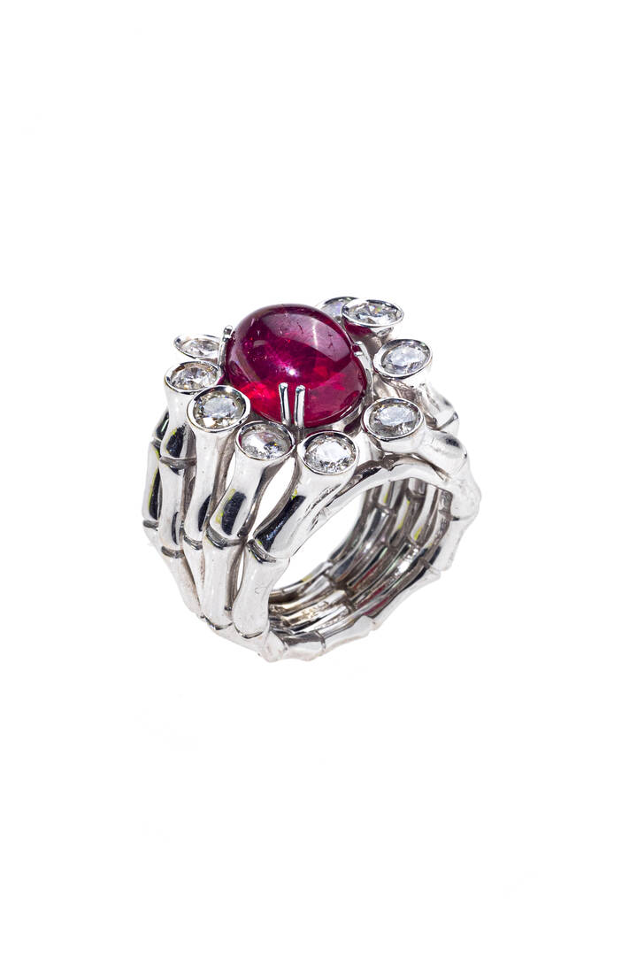 in oro bianco, gambo lavorato a motivo bambù, al centro tormalina cabochon di ct 7,0 ca e a contorno diamanti taglio brillante per totale ct 2,0 ca