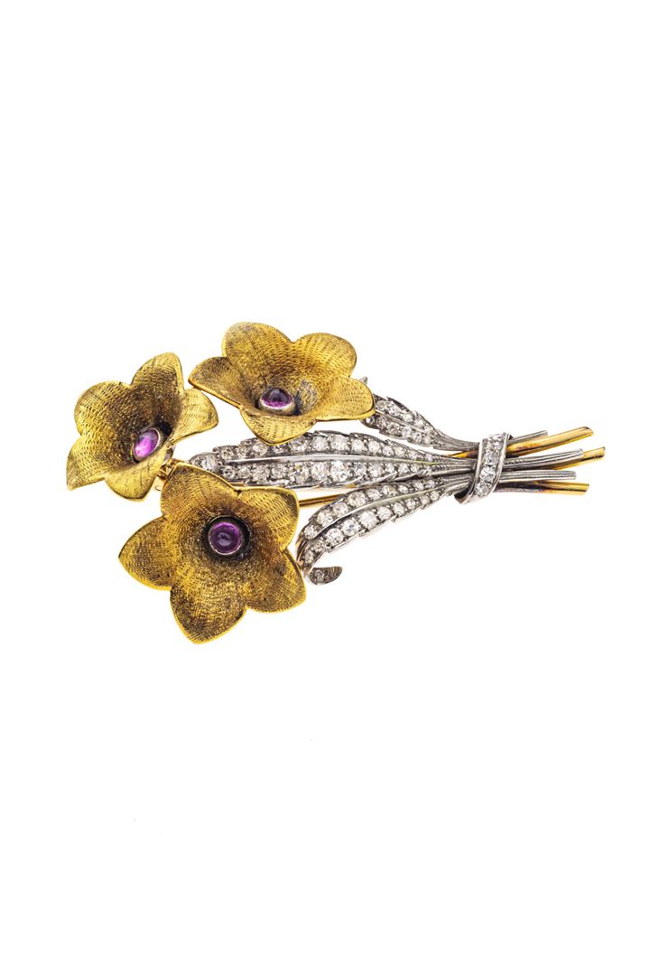 in oro giallo satinato e bianco, anni '50, a forma di ramo fiorito con tre fiori con diamanti taglio 8/8 per totali ct 0,65 ca e tre rubini cabochon.