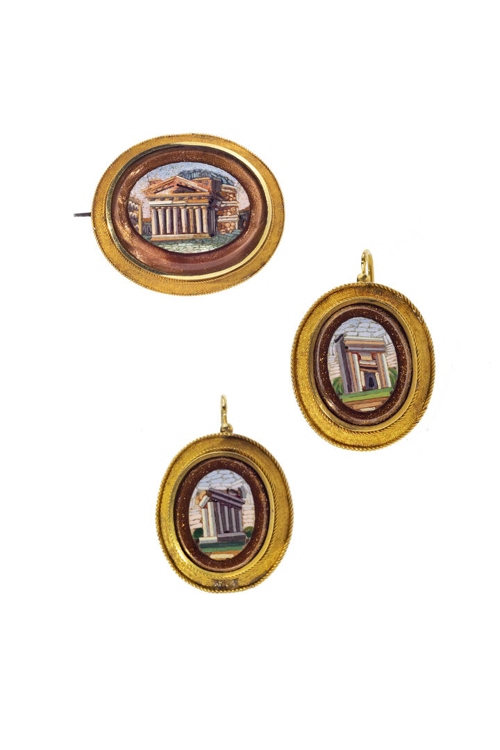 in oro a bassa caratura composta da spilla e coppia di orecchini, XIX secolo, con micromosaici vitrei montati su base in pietra del sole raffiguranti il Pantheon, il Tempio di Saturno e l'Arco di Settimio Severo