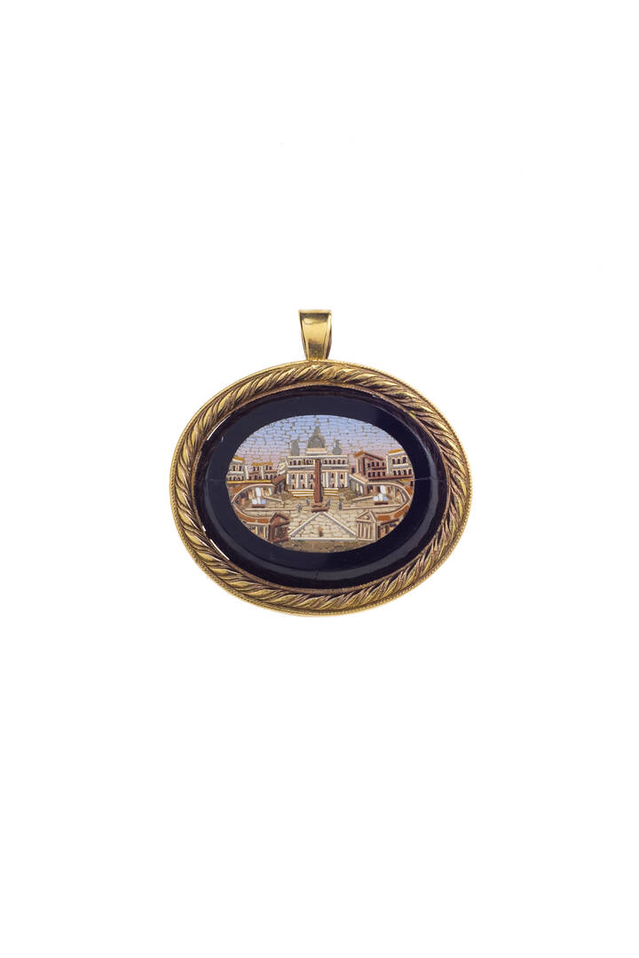 in oro giallo, bordo lavorato a torchon, trattenente cornice in onice con micromosaico vitreo raffigurante Piazza San Pietro a Roma eseguito dopo il 1874