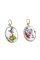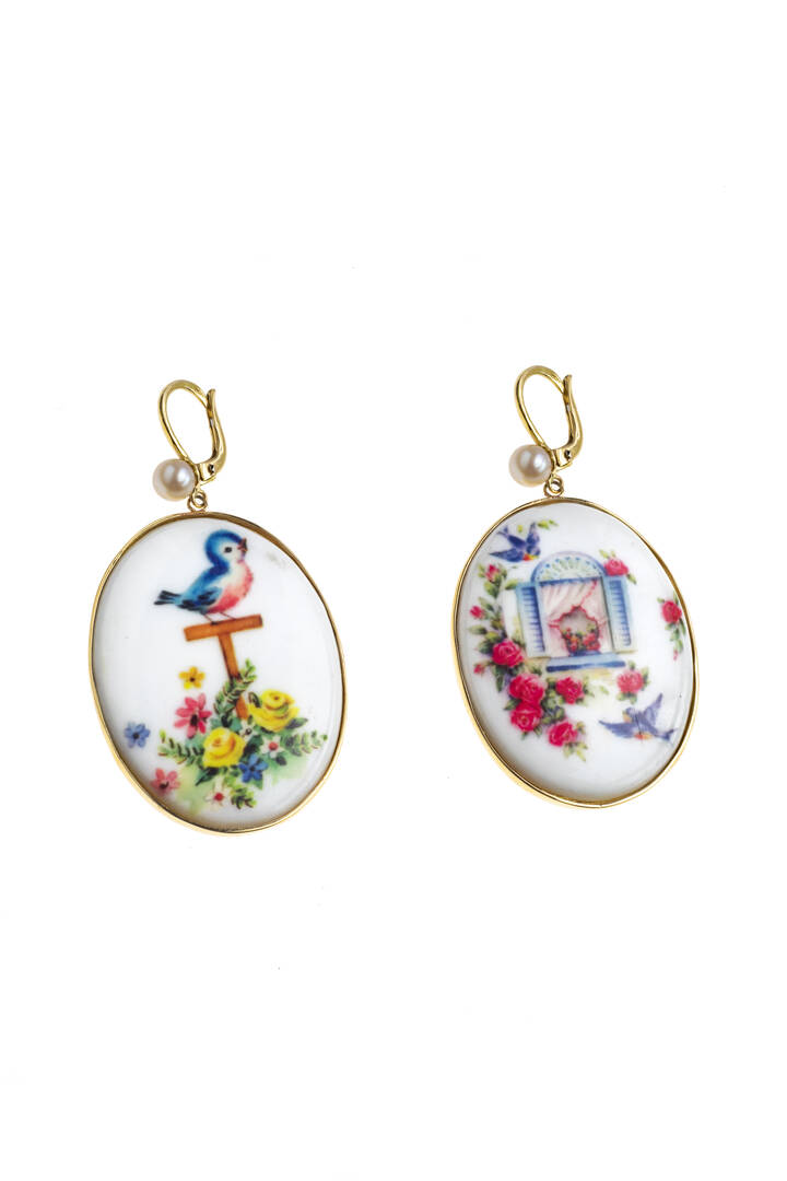 con due grandi dischi in ceramica decorata con fiori ed uccelli. Montatura in oro giallo