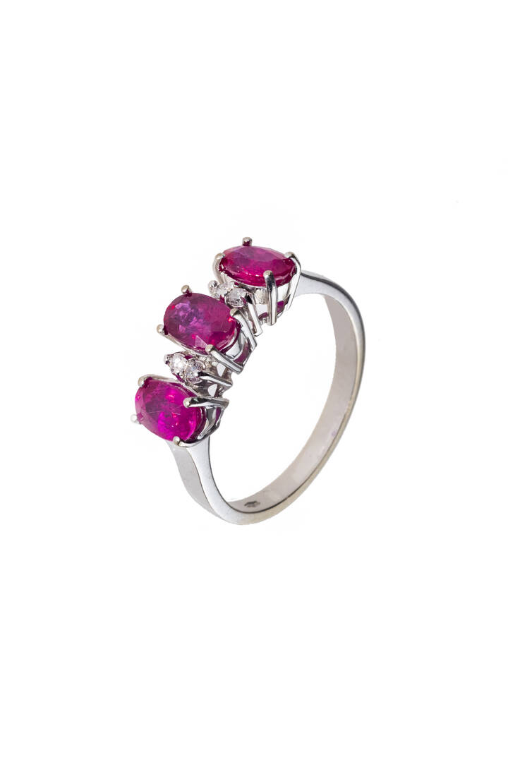 in oro bianco, sommità con tre rubini taglio ovale per totali ct 1,30 ca e piccoli quattro piccoli diamanti taglio brillante per totali ct 0.03