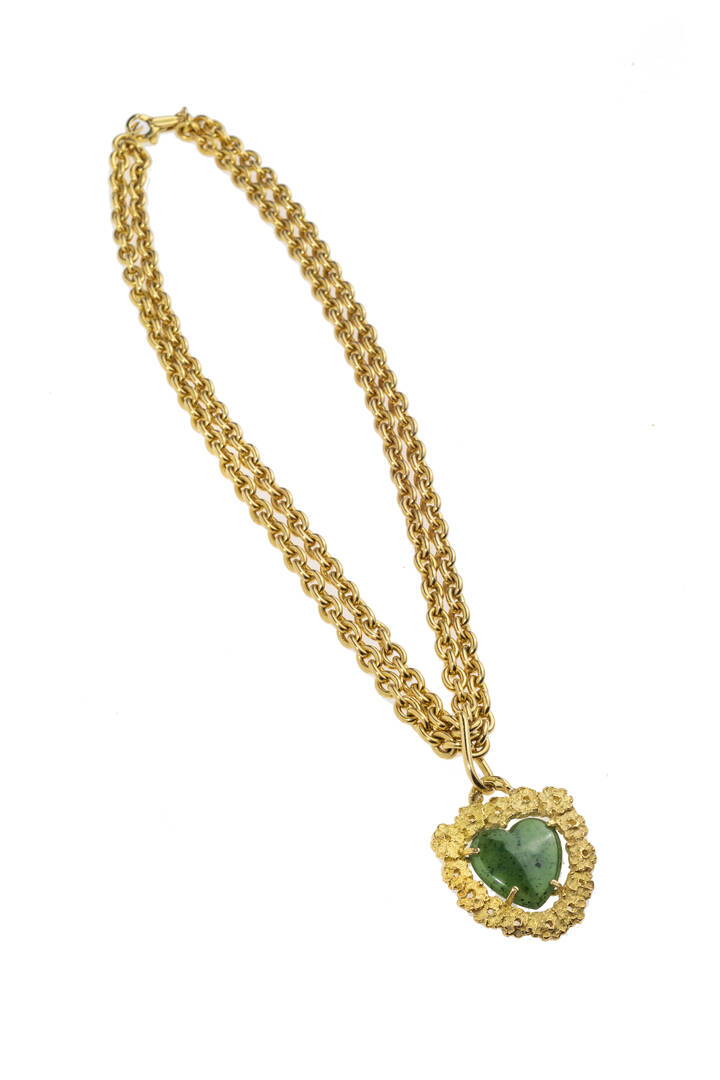 in oro giallo composto da catena ad anello ovalizzato e ciondolo satinato a forma di cuore trattenente giadeite verde taglio a cuore.