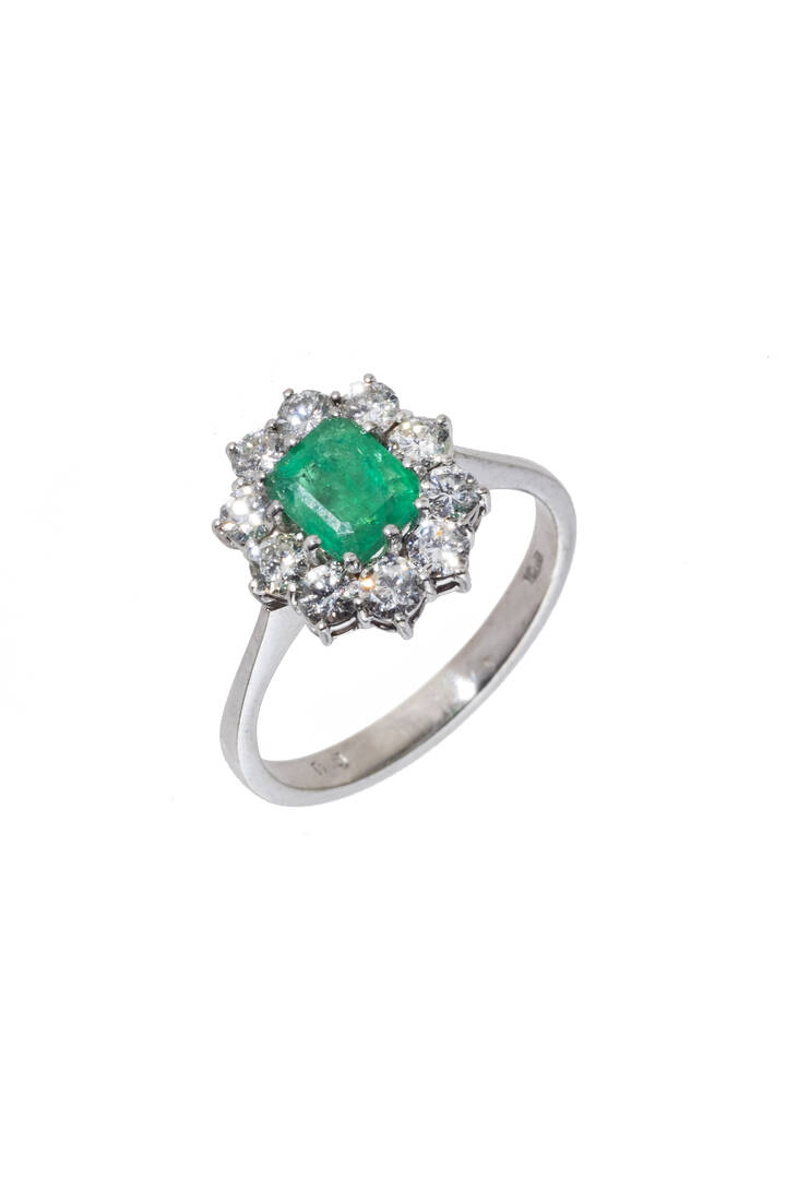 in oro bianco, sommità con smeraldo taglio ottagonale a gradini di ct 0,60 ca, contornato da diamanti taglio brillante per totali ct 0,50 ca