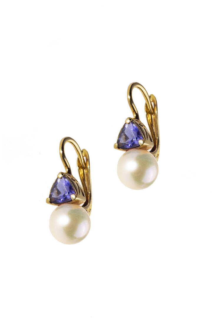 in oro giallo con due perline di acqua dolce del diam di mm 7,5 sormontate da due pietre sintetiche di colore blu, firmati "Mimì"