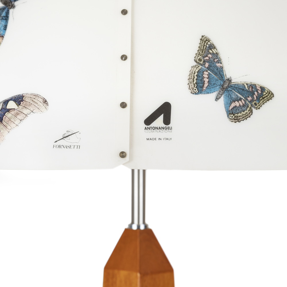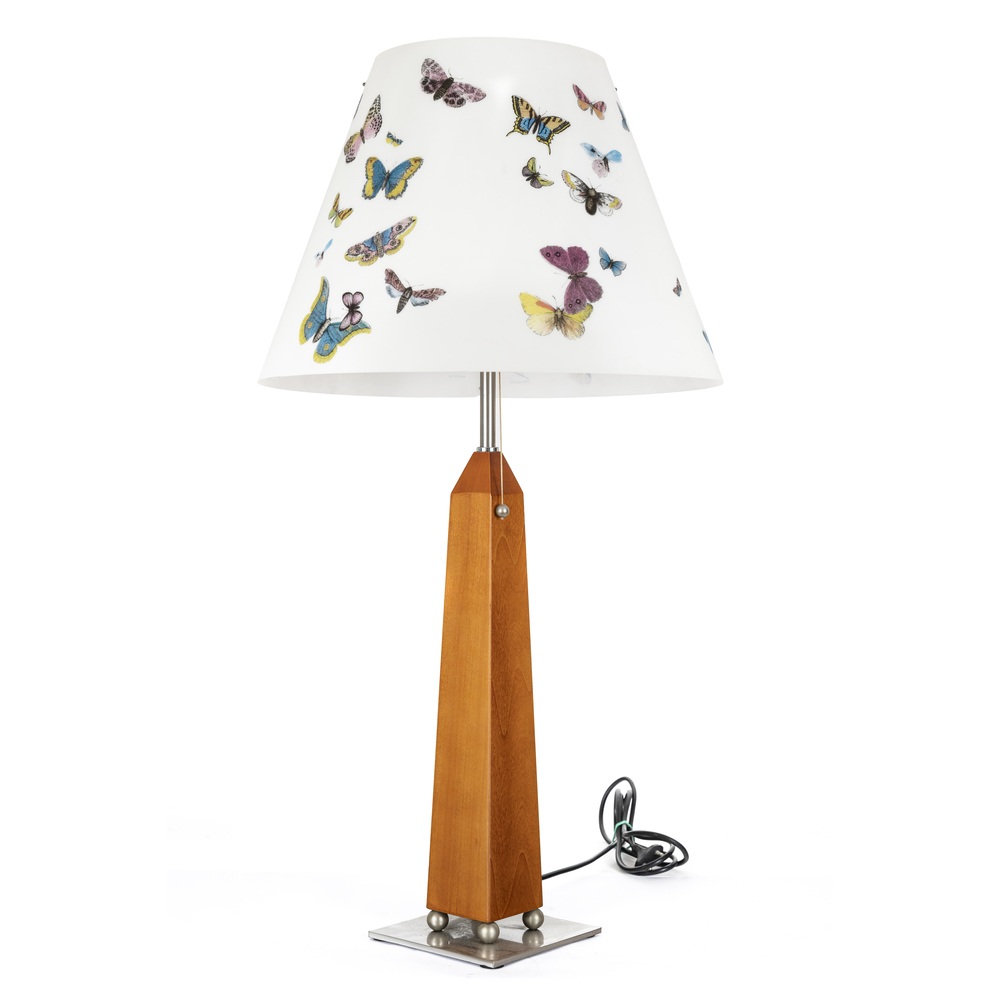 Base in ferro dorato, fusto in legno a forma obelisco e paralume con disegni a farfalle
