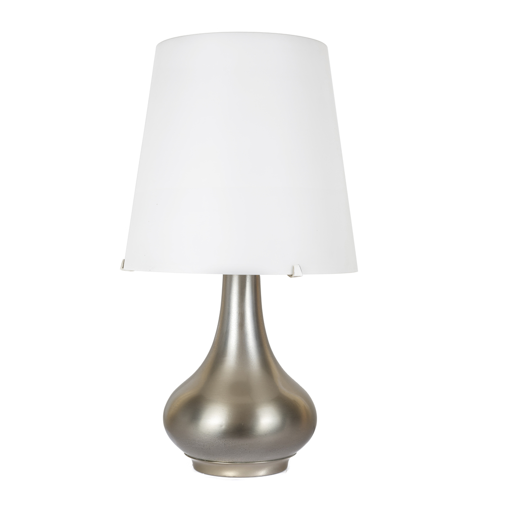 Brushed nickel-plated metal base and satin white opaline blown glass diffuser