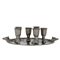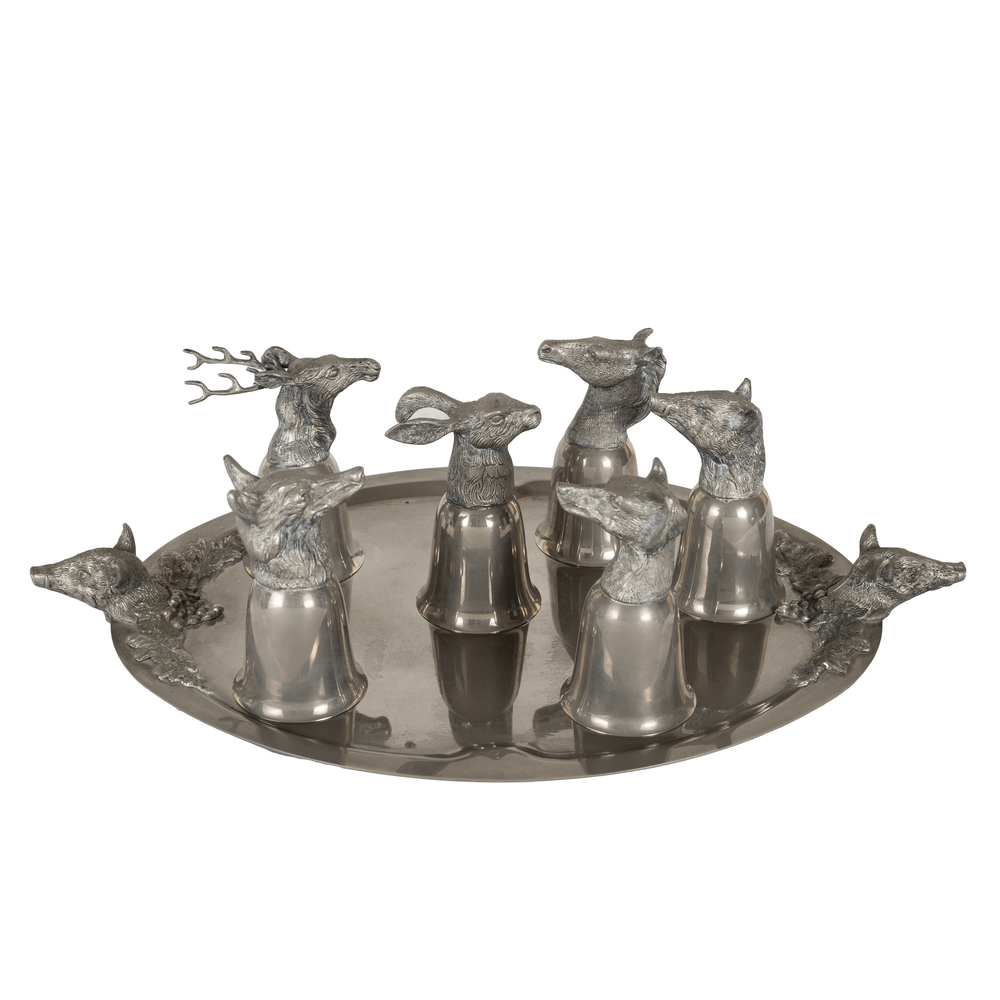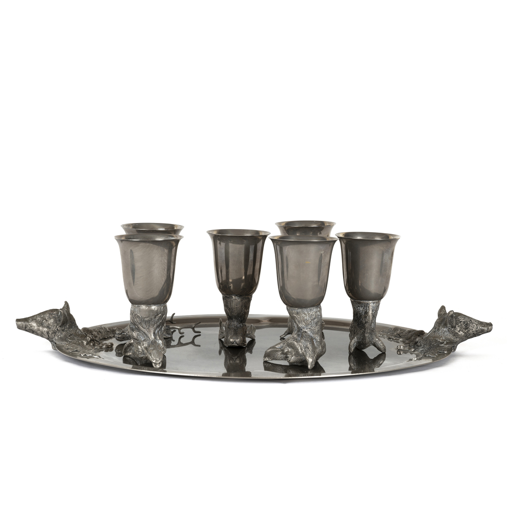 Composto da vassoio e sei bicchieri della staffa decorati con teste di animali