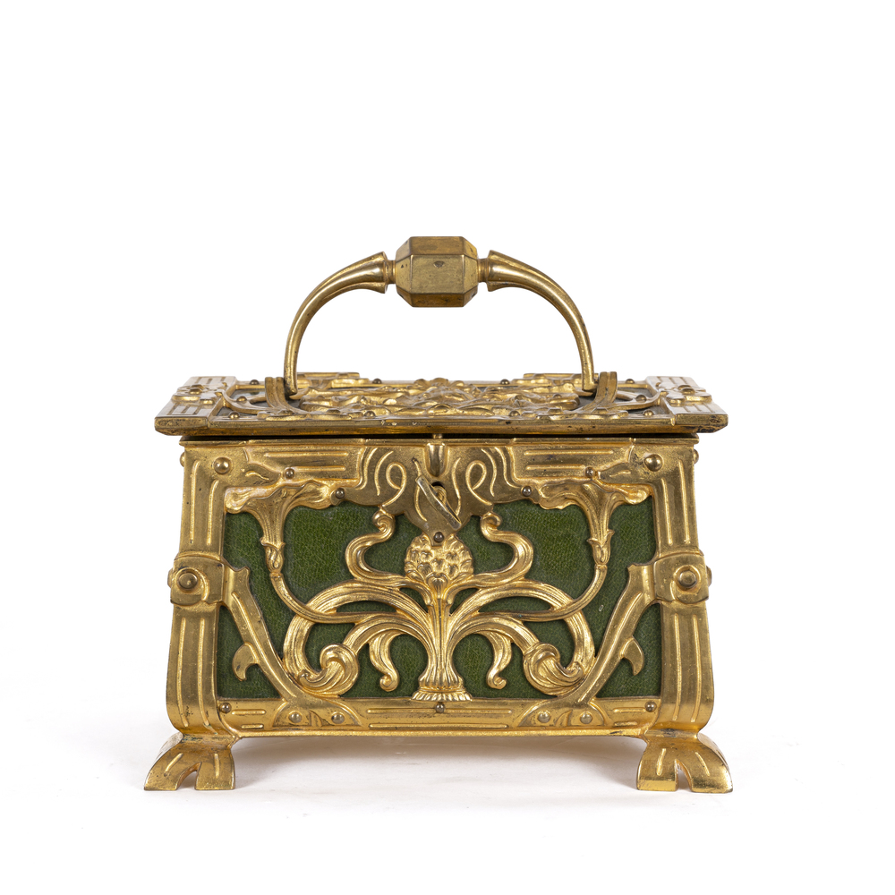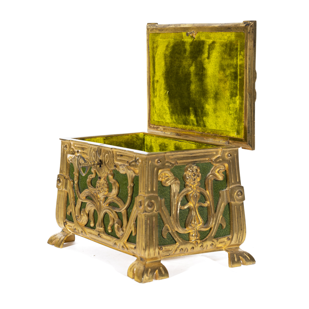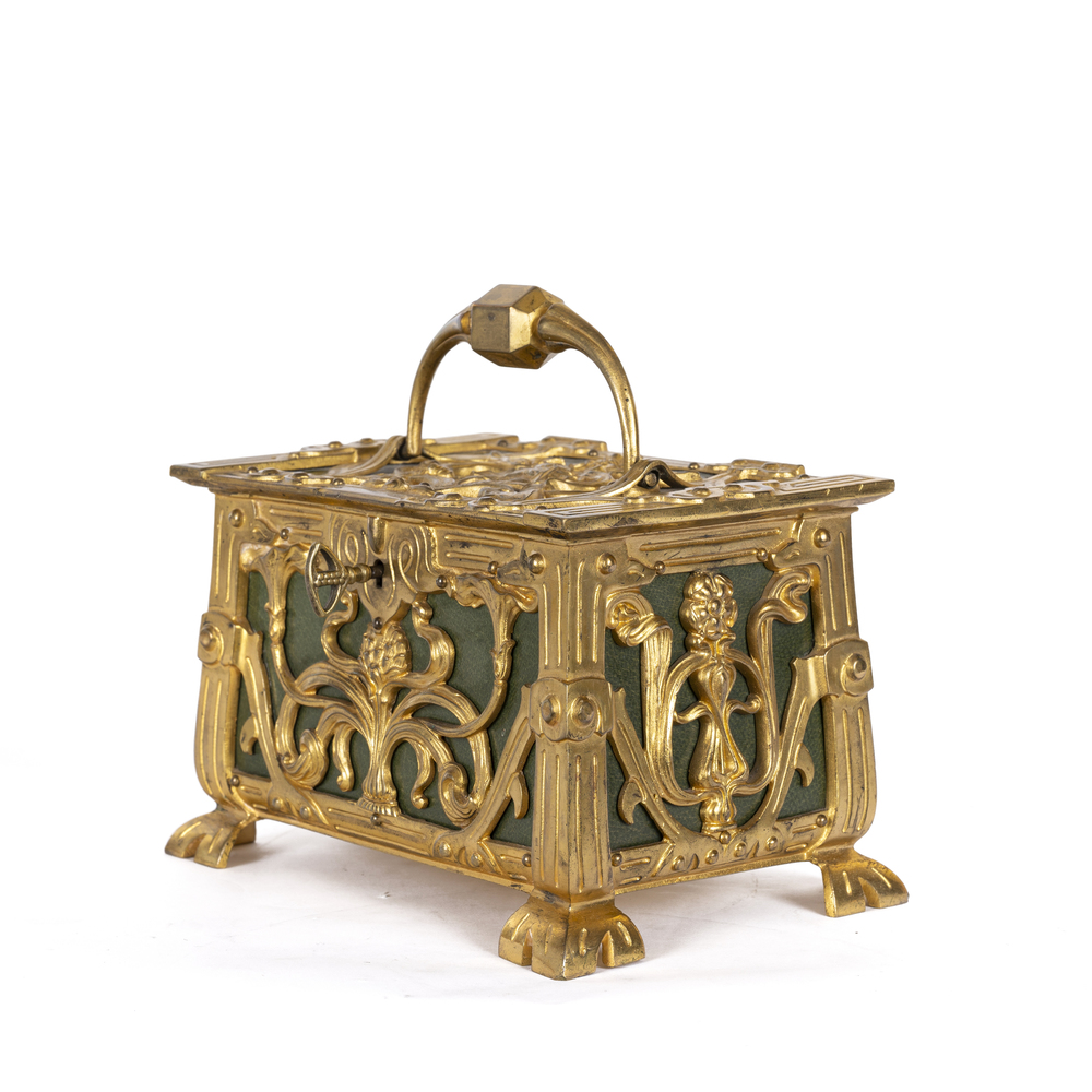 Scatola porta gioie con applicazioni in bronzo dorato