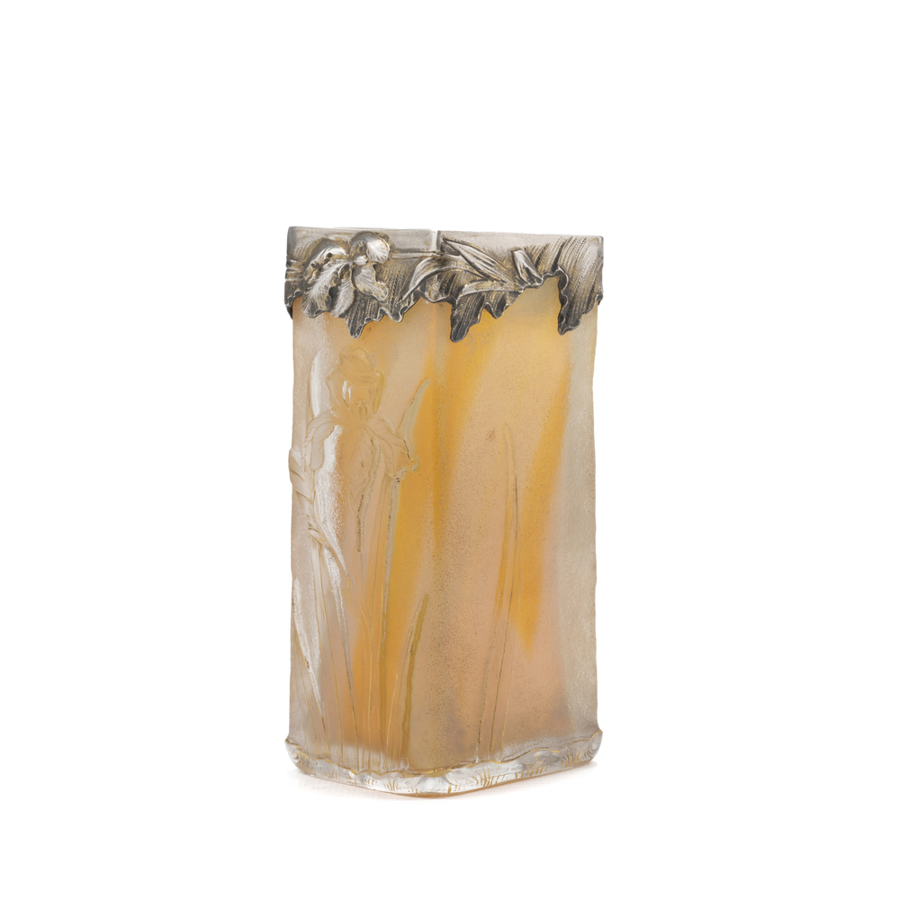 Vaso in vetro con base quadrata e applicazioni in argento al bordo superiore