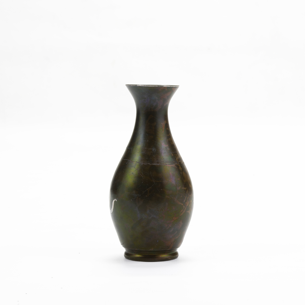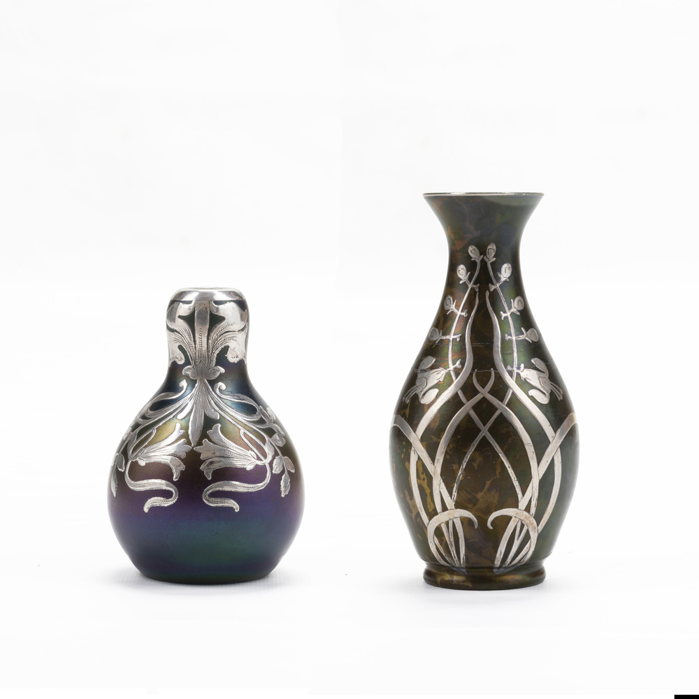 Un vaso a balaustro e una ampolla in vetro con applicazioni in argento a decoro floreale