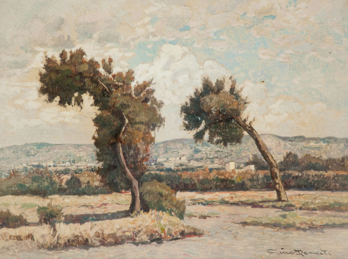 Gino Romiti Paesaggio Olio su faesite, cm. 29,5x39,5 Firmato in basso a destra; Sul verso: etichetta di provenienza.