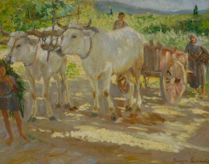 Giuseppe Fraschetti Scena agreste Olio su tavola, cm. 54,5x68,5 Firmato in basso a destra.