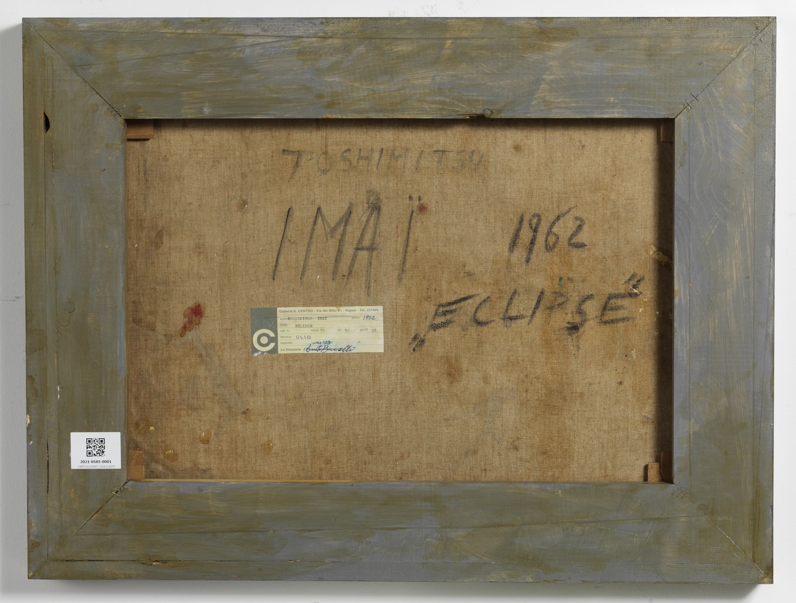 IMAI TOSHIMITSU (1928 - 2002) Eclipse. 1962. Olio su tela . Cm 70,00 x 50,00. Al retro titolo, firma, anno e cartiglio descrittivo Galleria Il Centro, Napoli. Provenienza: Galleria Il Centro, Napoli; Collezione privata, Roma. Autentica su fotografia di Alexandre Imai.