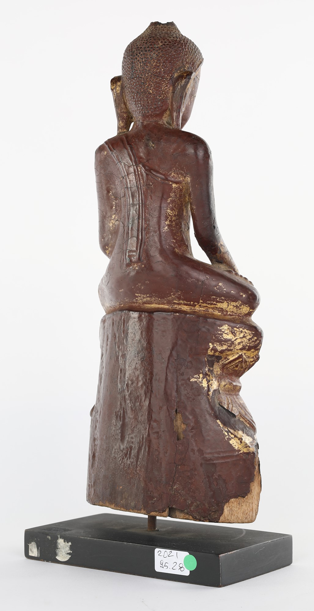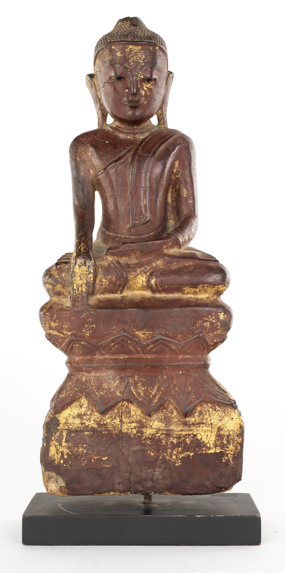 Buddha Bhumispharsa in legno laccato rosso, Stato Shan, Birmania, XVIII secolo con tracce di doratura, cm 34,5x14,5