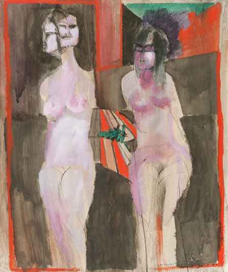 Bruno Cassinari Nudi, 1962 Acquerello e china su cartoncino applicato su tela, cm., 60x50 Firma e data in basso a destra; Sul verso: etichetta e timbro "Galleria del Milione", Milano con descrizione.