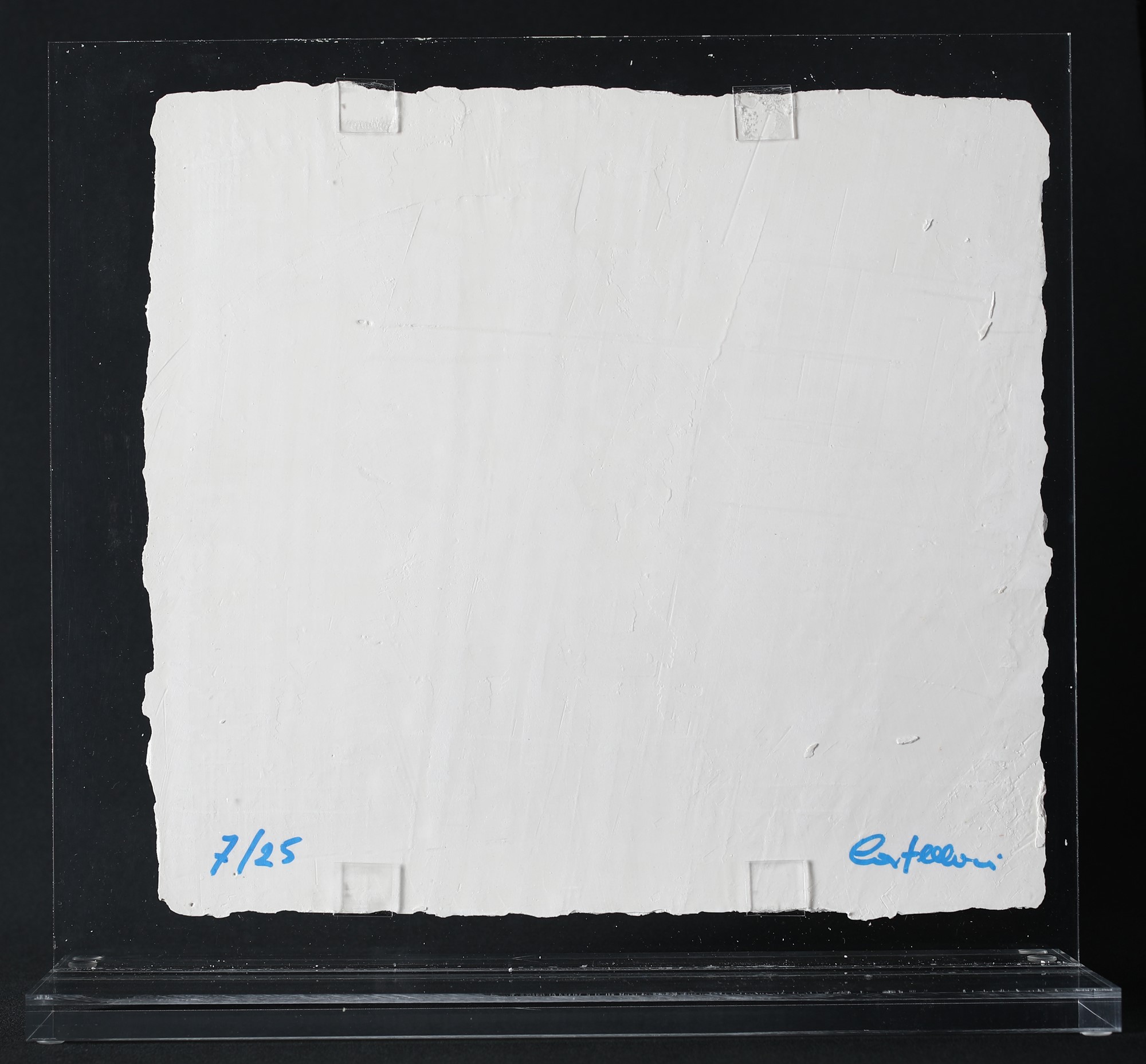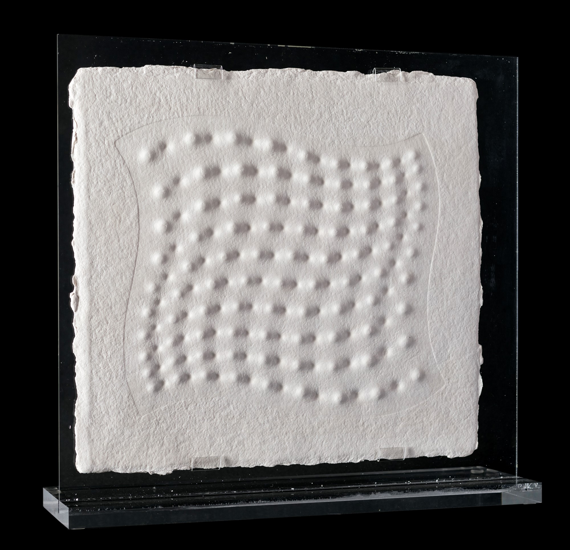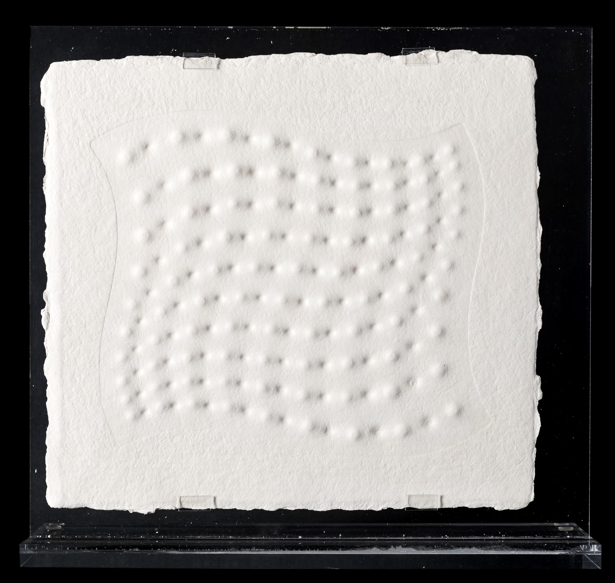 Enrico Castellani, Multiplo Due, 2010 Superficie in rilievo su jesmonite in resina bianca cm 28x30 (cm 34x35x10 (supporto in perspex) Firma e numerazione al verso "Castellani 7/25". La tiratura complessiva è stata realizzata in 25 esemplari numerati in numeri arabi più 8 prove d'artista numerate in numeri romani. Opera con imballo originale (numerato sul lato 7/25) e certificato.