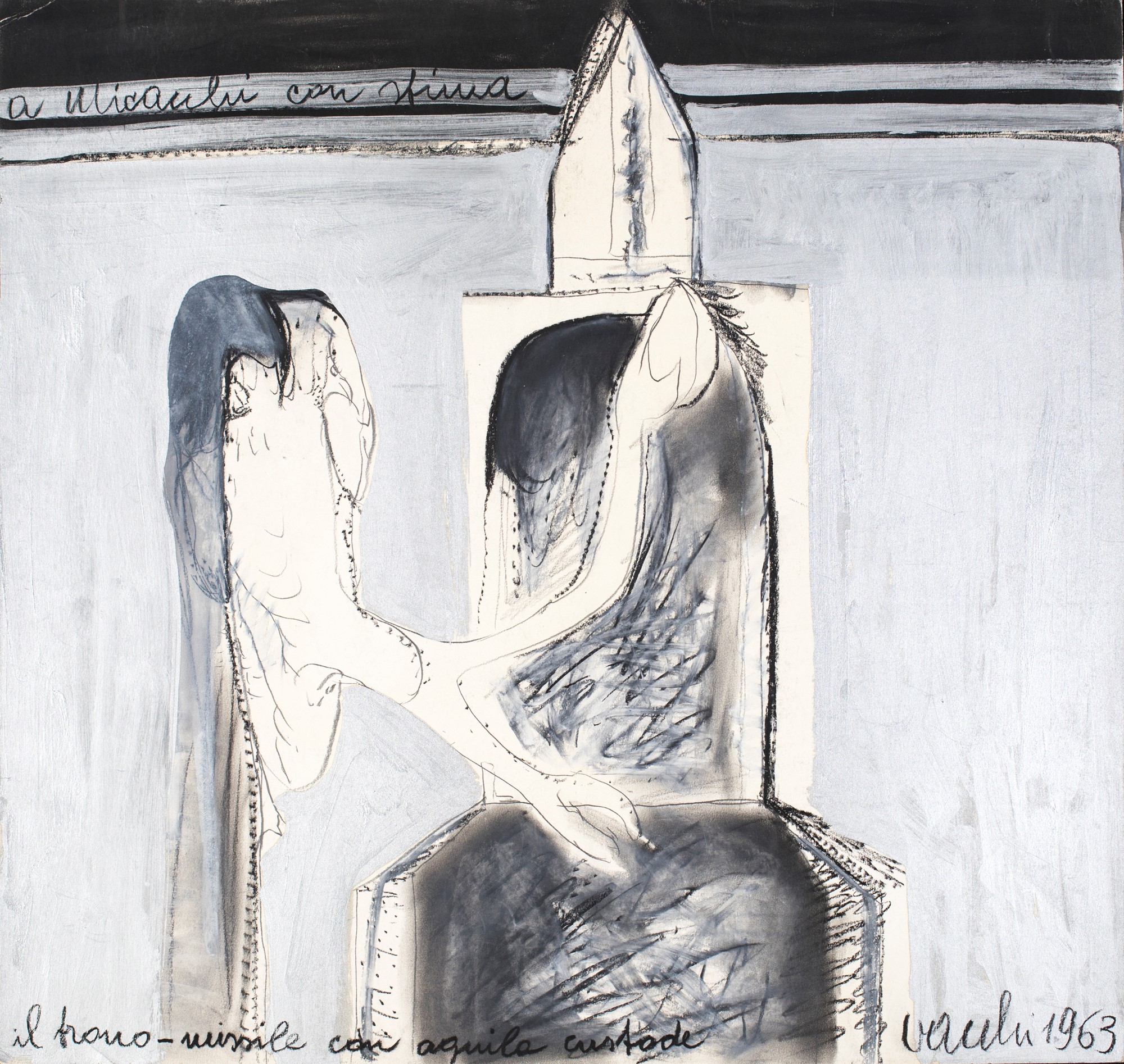 Sergio Vacchi, Il trono-missile con aquila custode, 1963 Matita, pastelli...