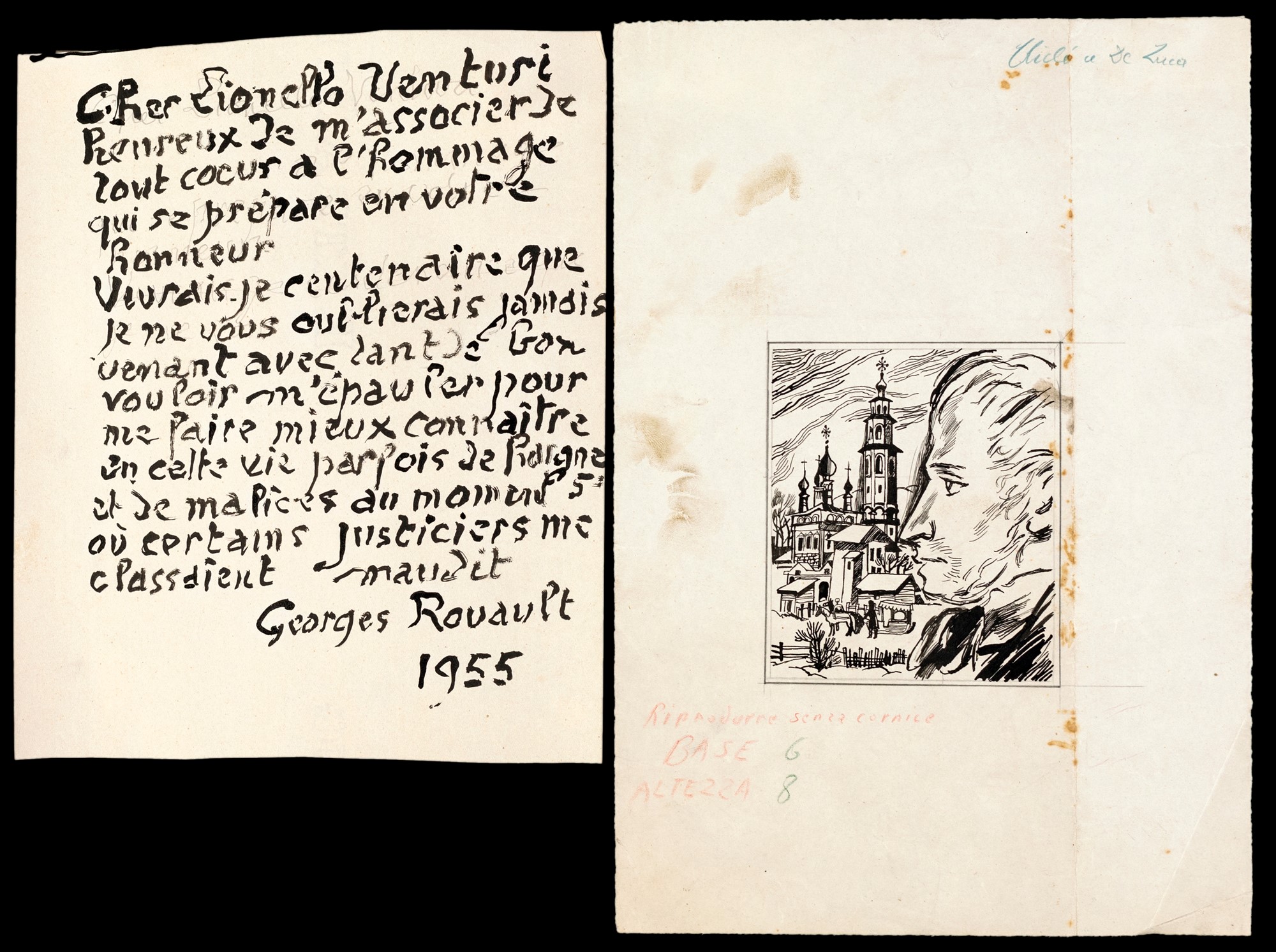 Lettera indirizzata a Lionello Venturi, firmata e datata "Georges Rouault 1955", cm 25,5x20,7. Insieme alla lettera disegno a matita e china su carta, cm 32x22.