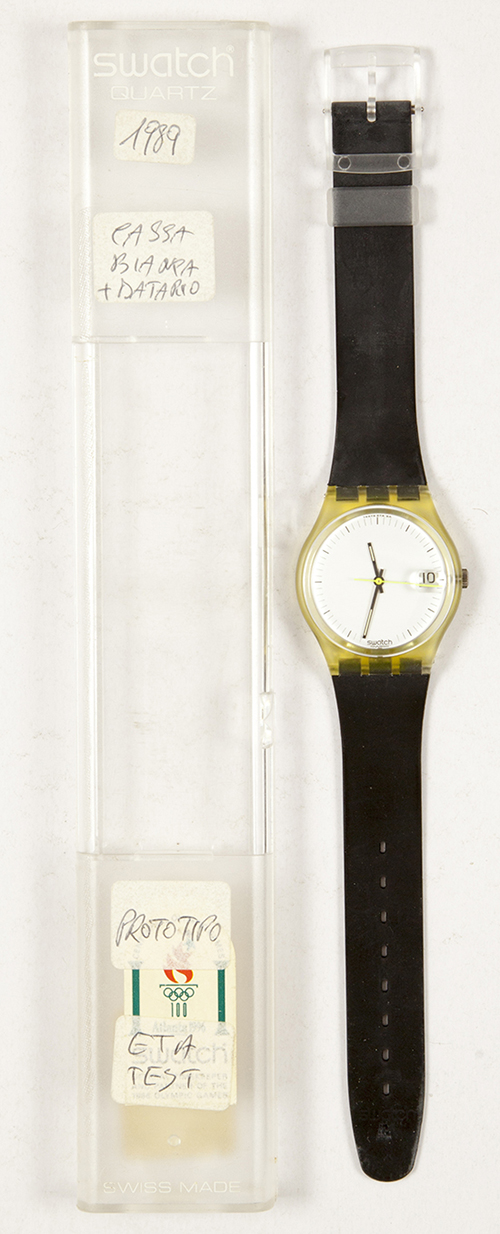 NOTE: Cassa trasparente, cinturino nero, quadrante ETA TEST con datario e lente di lettura, lancette ore e minuti fini nere mentre quella dei secondi Ë gialla. Questo Ë un orologio test prima della produzione da considerarsi pezzo unico.