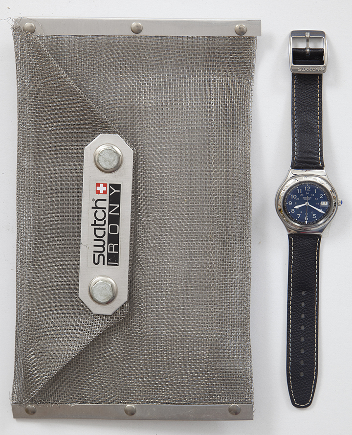 NOTE: borsetta in rete metallica con chiusura a bulloni, per contenere l' uscita del primo SWATCH IRONY