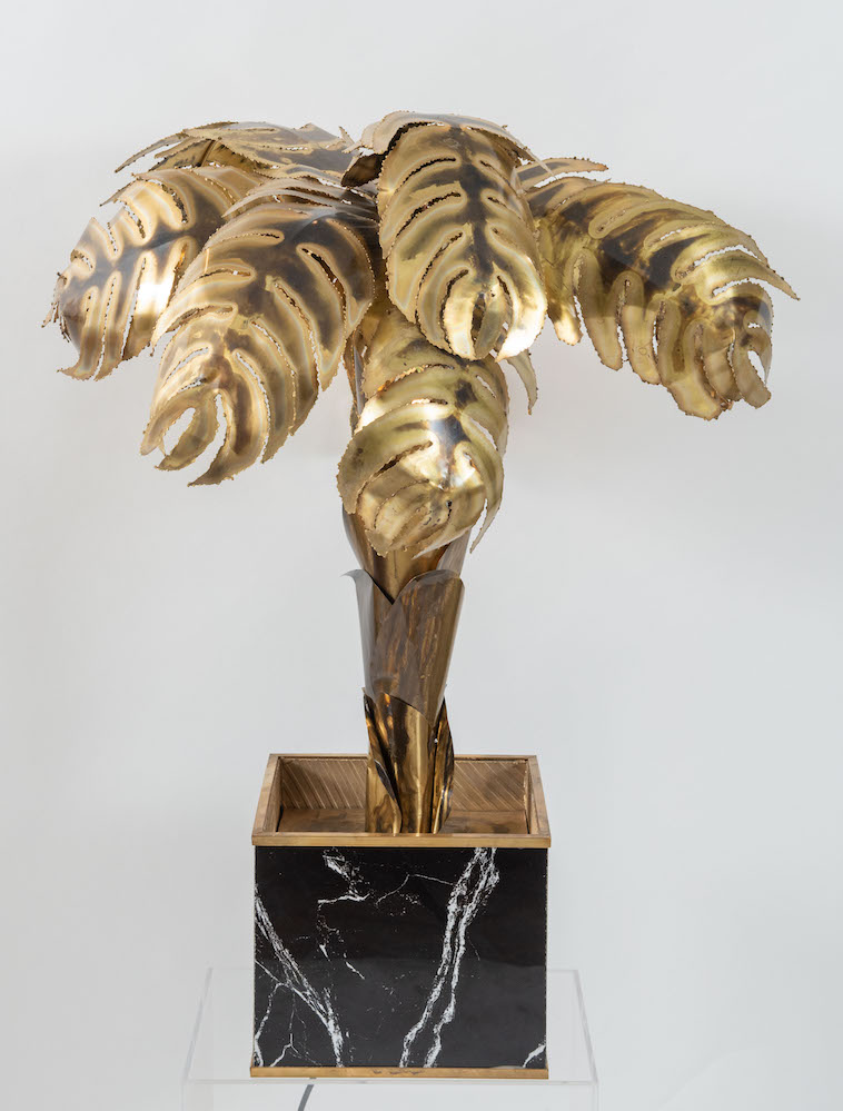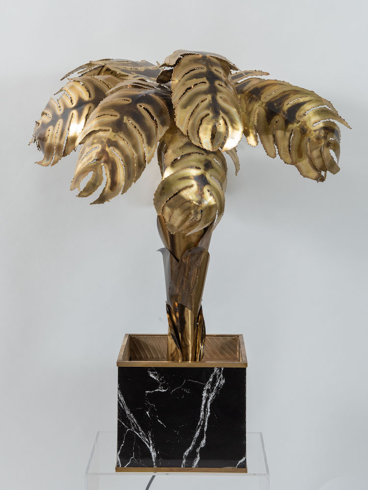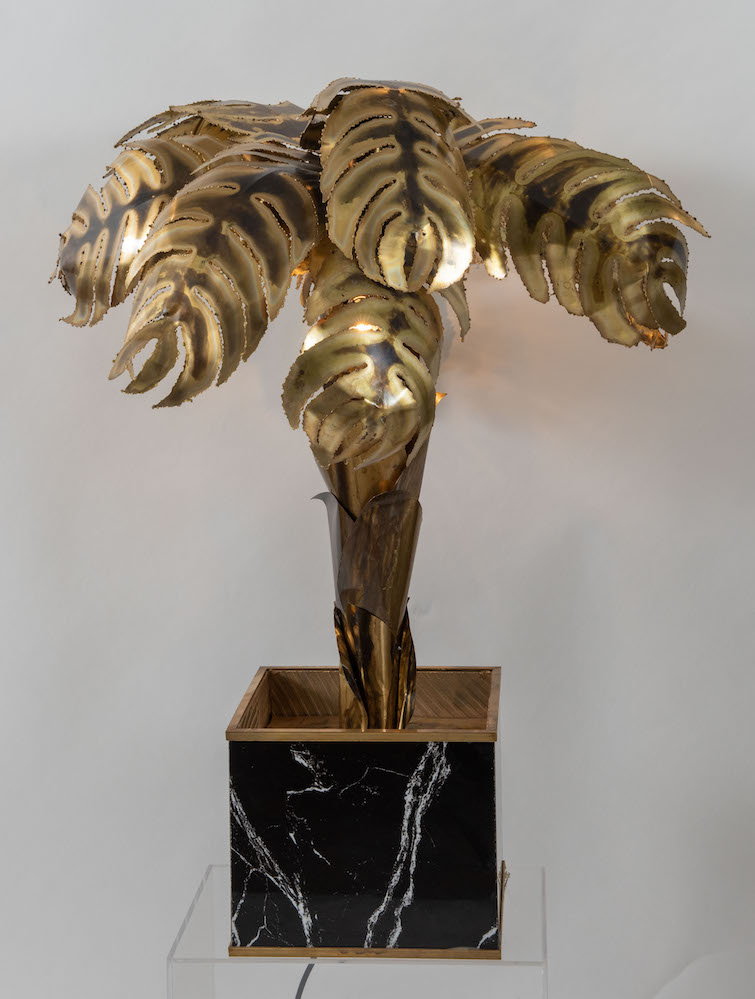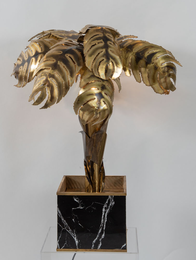 MAISON JANSEN, attr. Lampada da terra in ottone lavorato a mano con una base cubica in legno. Prod. Maison Jansen Att. ,Italia, 1970 ca. Cm 95x60x60.