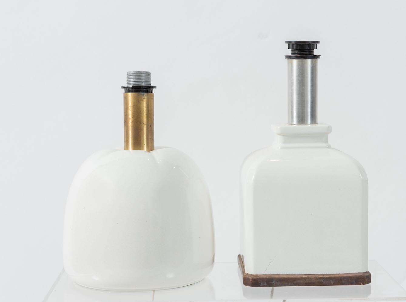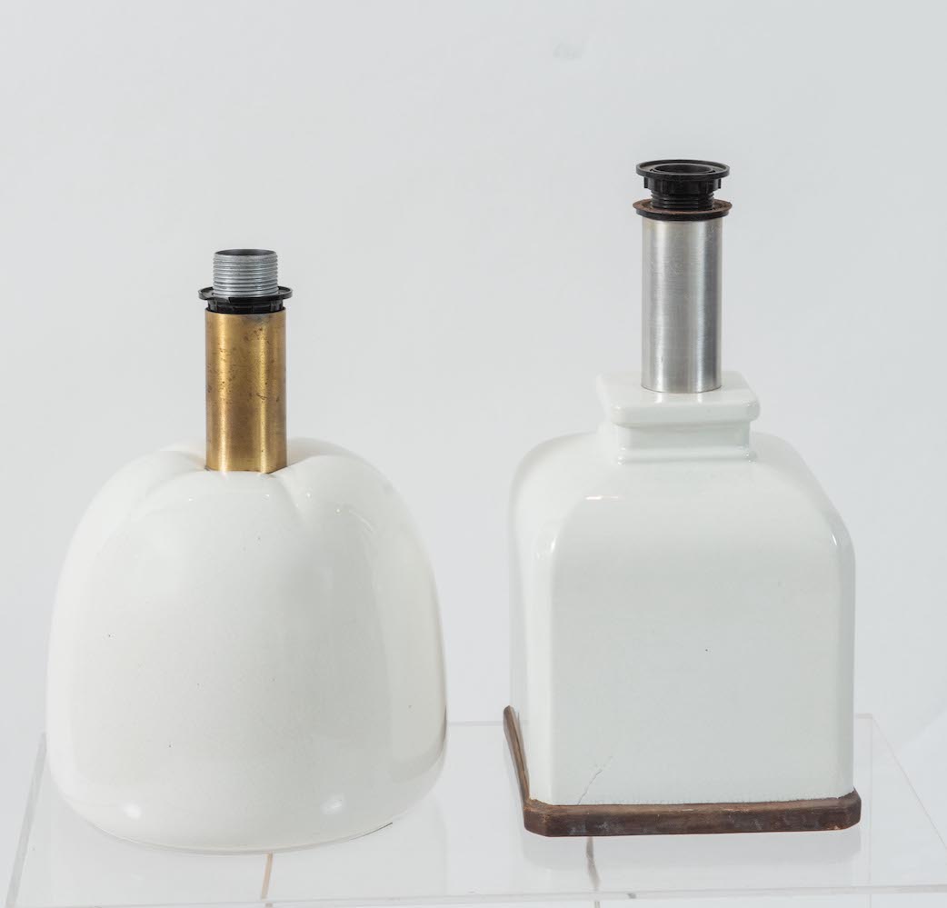 Coppia di lampade in ceramica smaltata. Prod. Italia, 1970 ca. Rispettivamente di cm 40x20x20 e cm 37x26x26.
