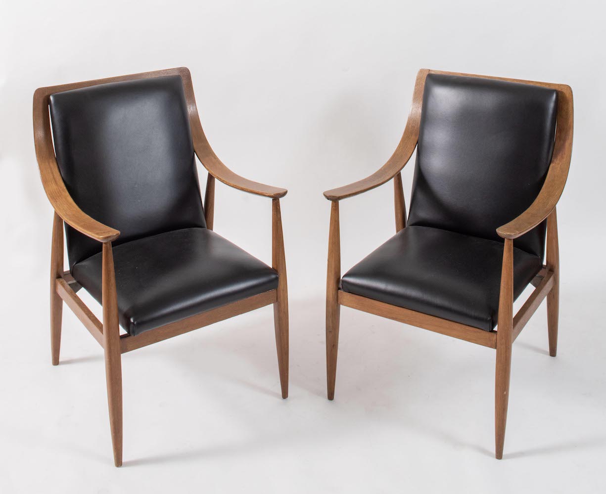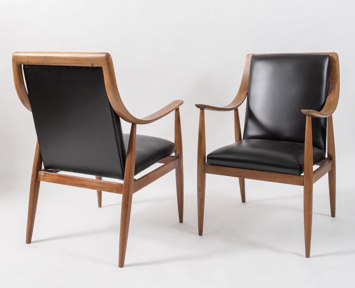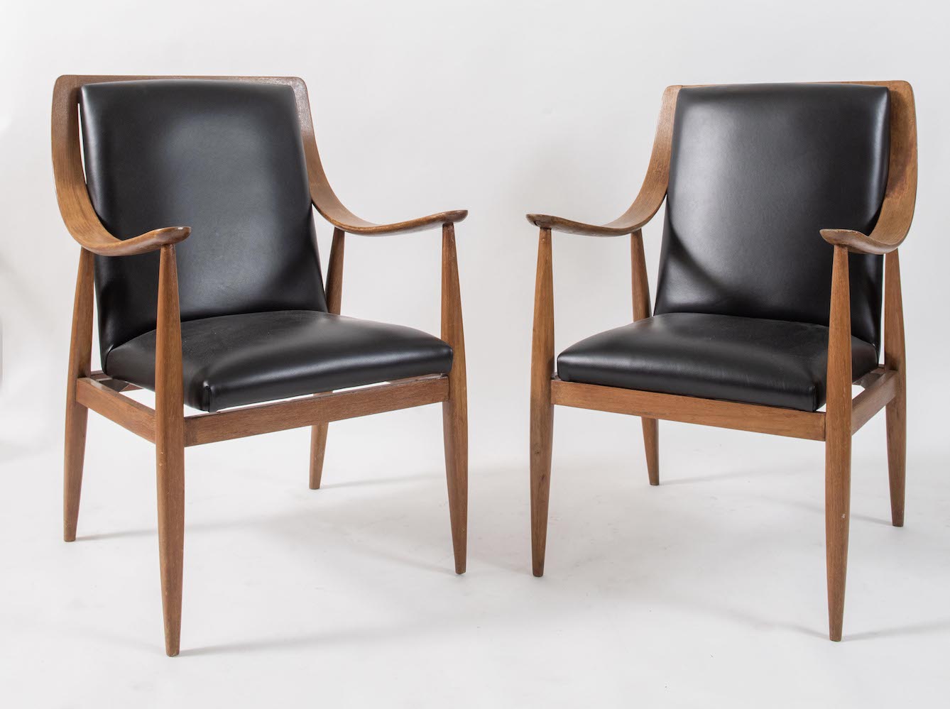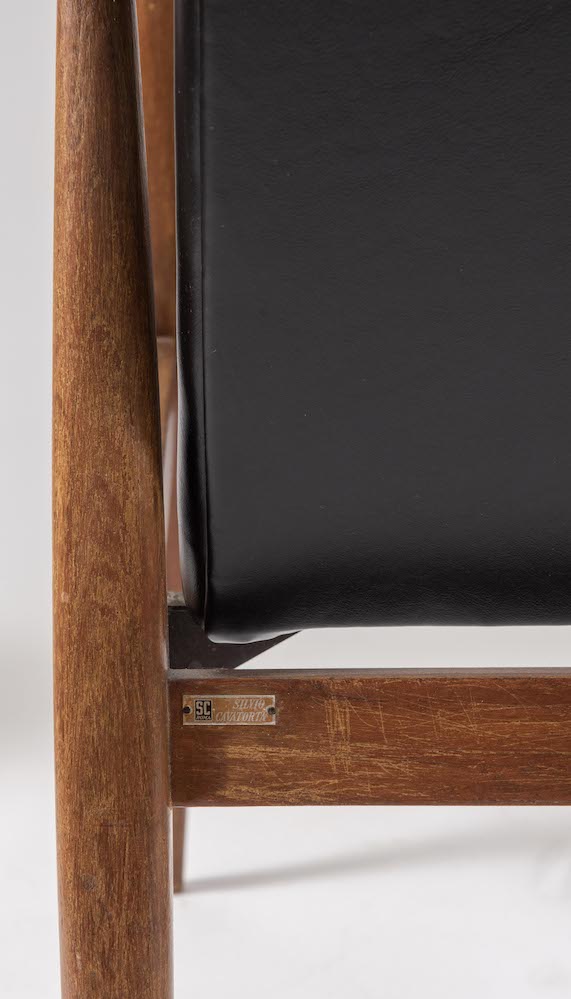 SILVIO CAVATORTA Coppia di poltroncine in legno di noce e seduta in pelle. Marchio originale. Prod. Silvio Cavatorta, Italia, 1950 ca. Cadauna di cm 97x53x55. Pubblicazioni: Irene de Gutty, Maria Paola Maino, Il mobile italiano degli anni ’40 e ’50,Laterza 2010, pag. 136.
