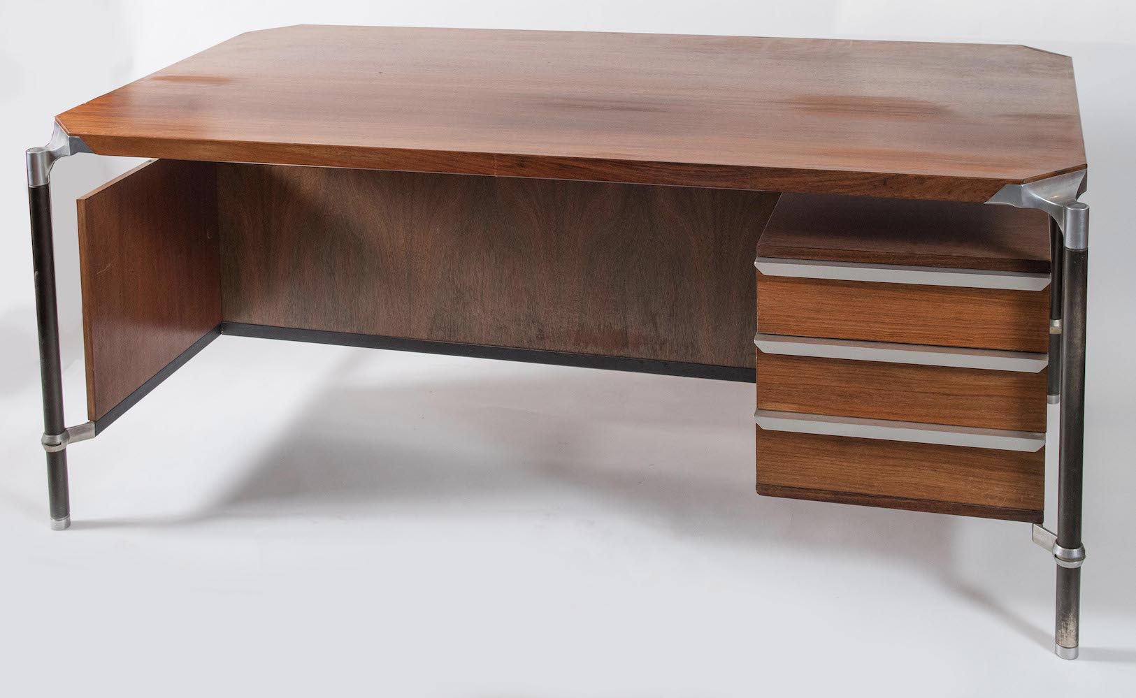 ICO & LUISA PARISI Scrivania in palissandro con struttura in metallo con tre cassetti. Marchio originale. Manca la serratura. Prod. MIM, Italia, 1962. Cm 70x90x180.