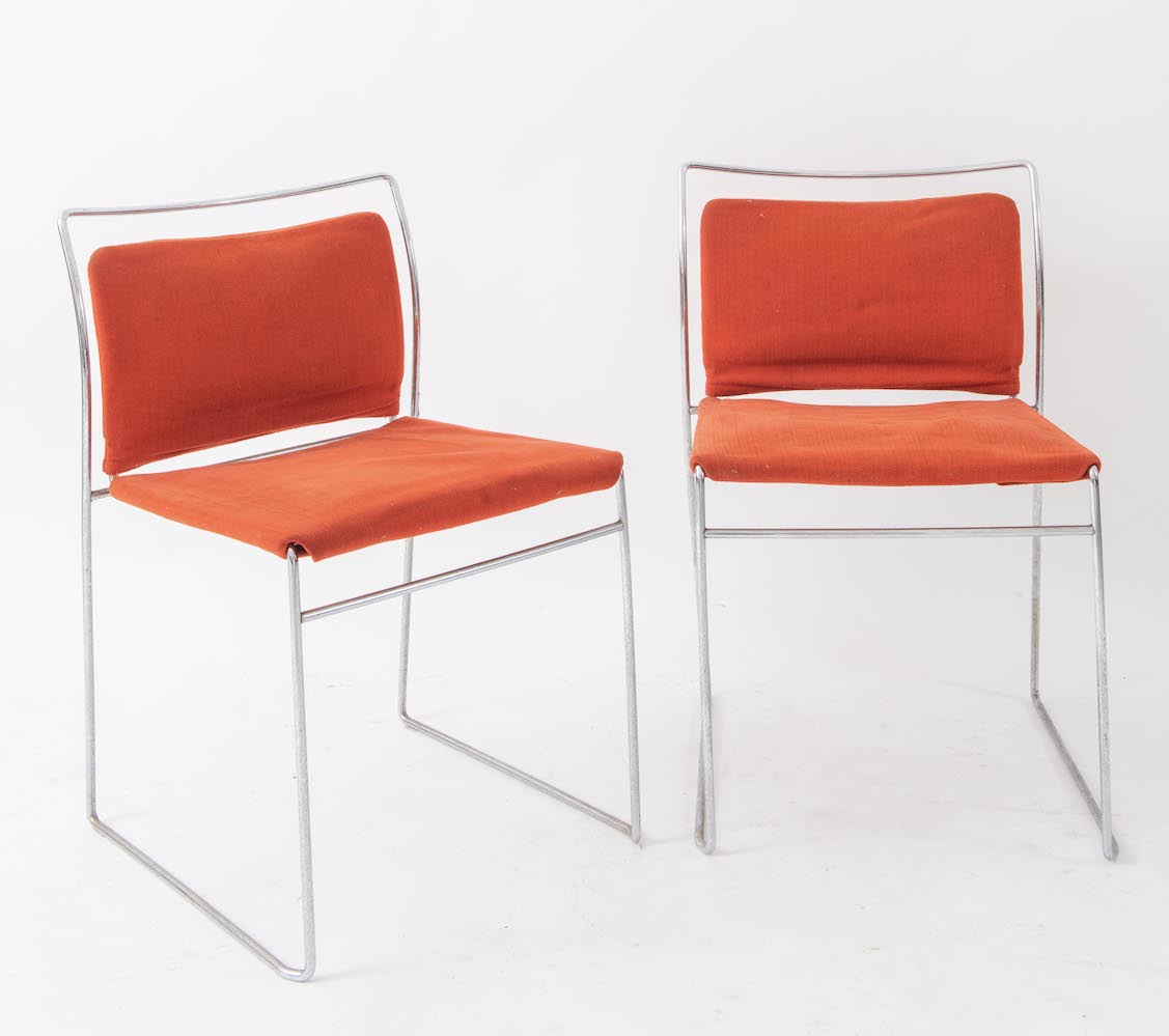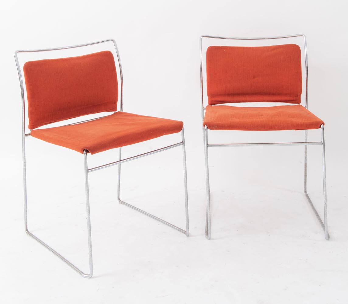 KAZUHIDE TAKAHAMA Quattro sedie in metallo e tessuto modello Tulu. Prod. Simon Gavina Ultramobile, Italia, 1968 Cadauna di cm 47x50x73. Pubblicazioni: Dino Gavina Ultrarazionale Ultramobile, Editrice compositori, Milano 1998, pag. 184-185.