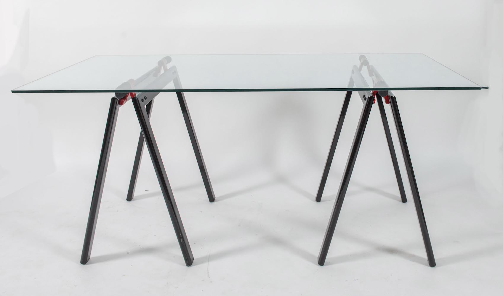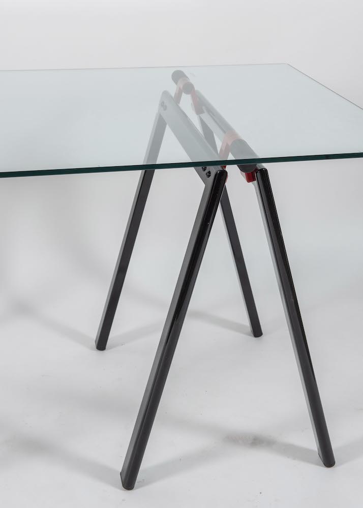 GAE AULENTI Tavolo con struttura in alluminio laccato e piano in vetro; modello Gaetano. Prod. Zanotta, Italia, 1973. Cm 71x182x81. Pubblicazioni: Repertorio del design italiano 1950-1980, Mondadori, Giuliana Gramigna, 1985, pag. 385.