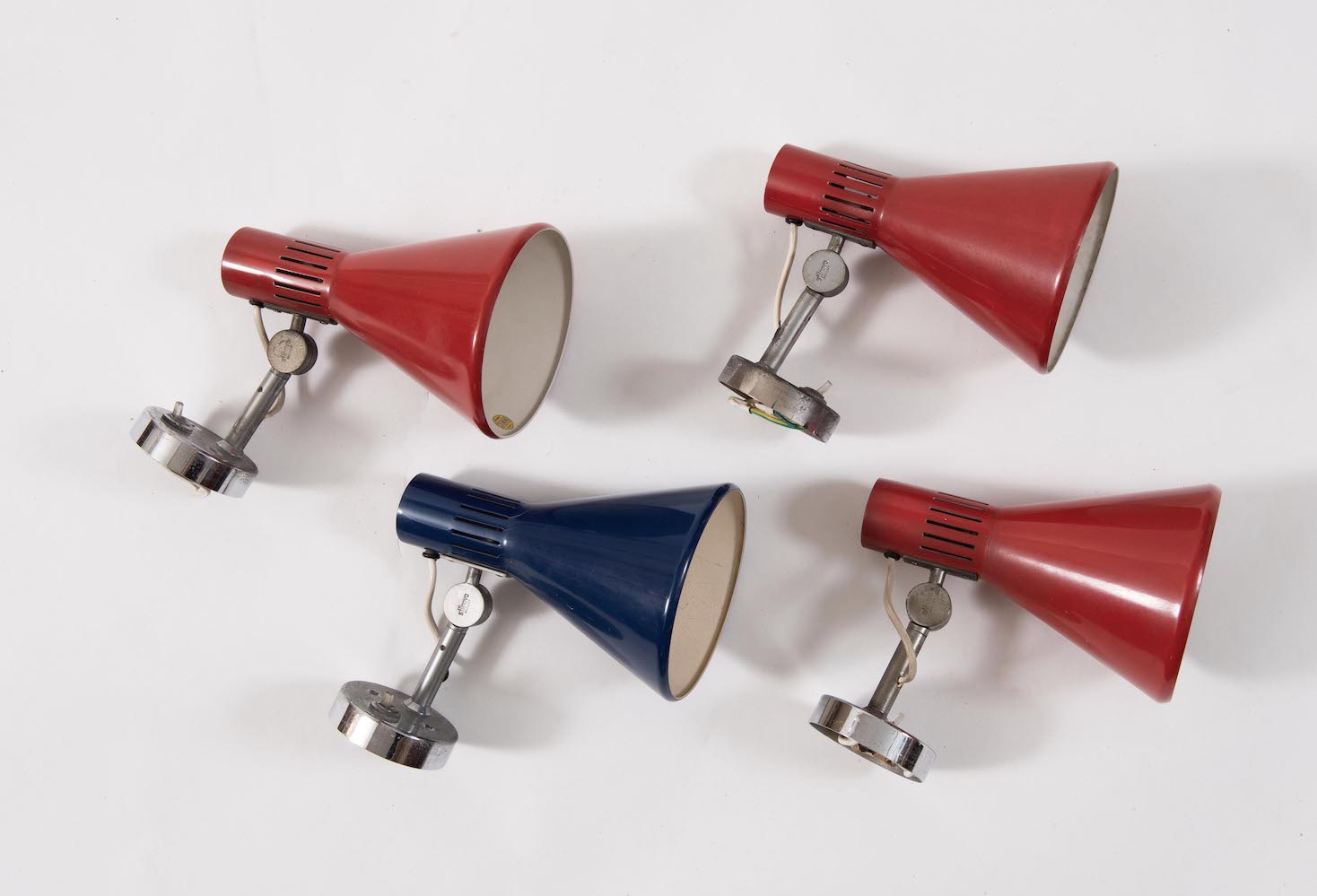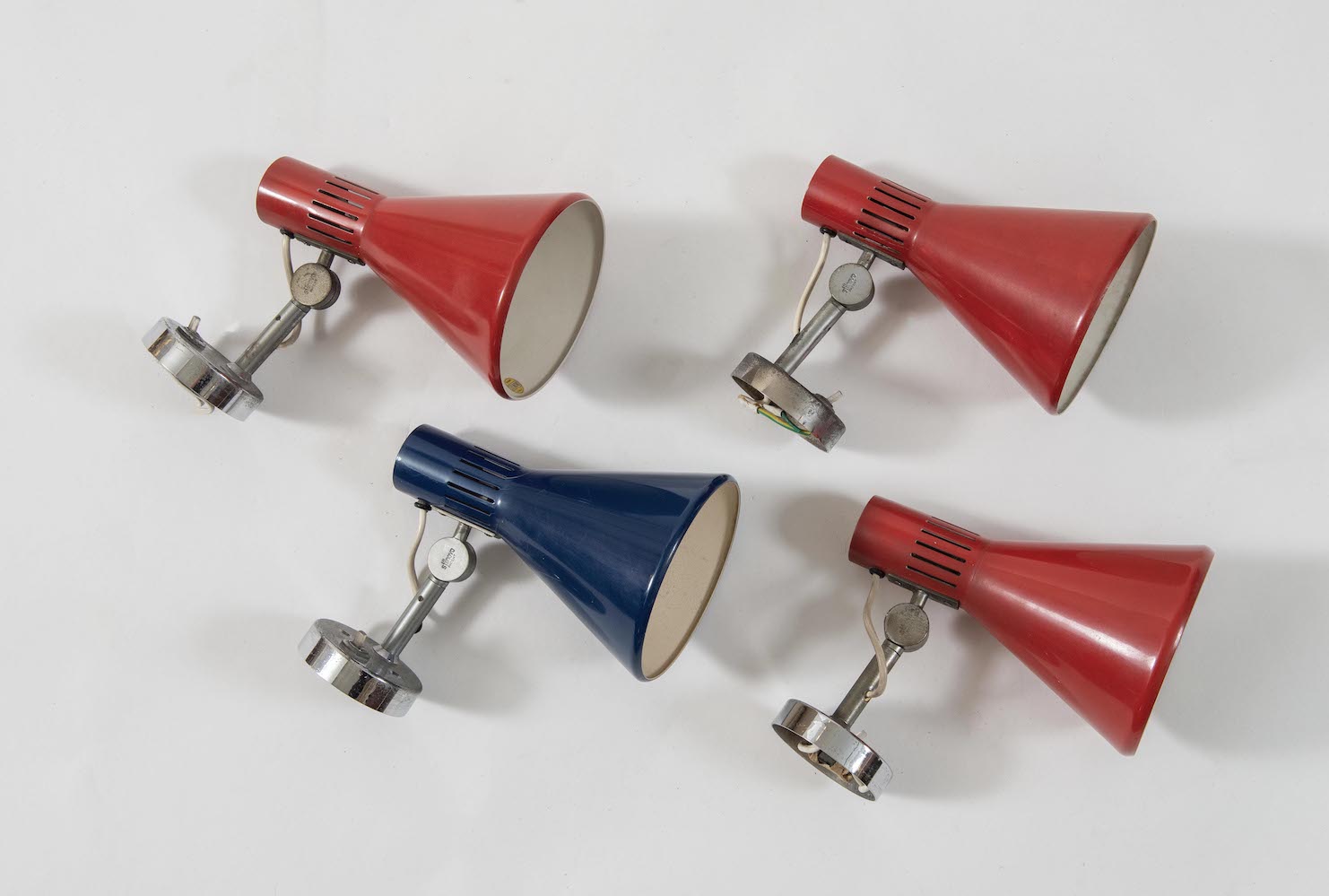 STILNOVO Quattro applique da muro mod. 2085 in metallo cromato e laccato. Marchio originale. Prod. Stilnovo, Italia, 1960 ca. Cadauna di cm 19x12x19. Pubblicazioni: Stilnovo apparecchi per l’illuminazione, Luminaires-moderniste, 2016, pag. 132.