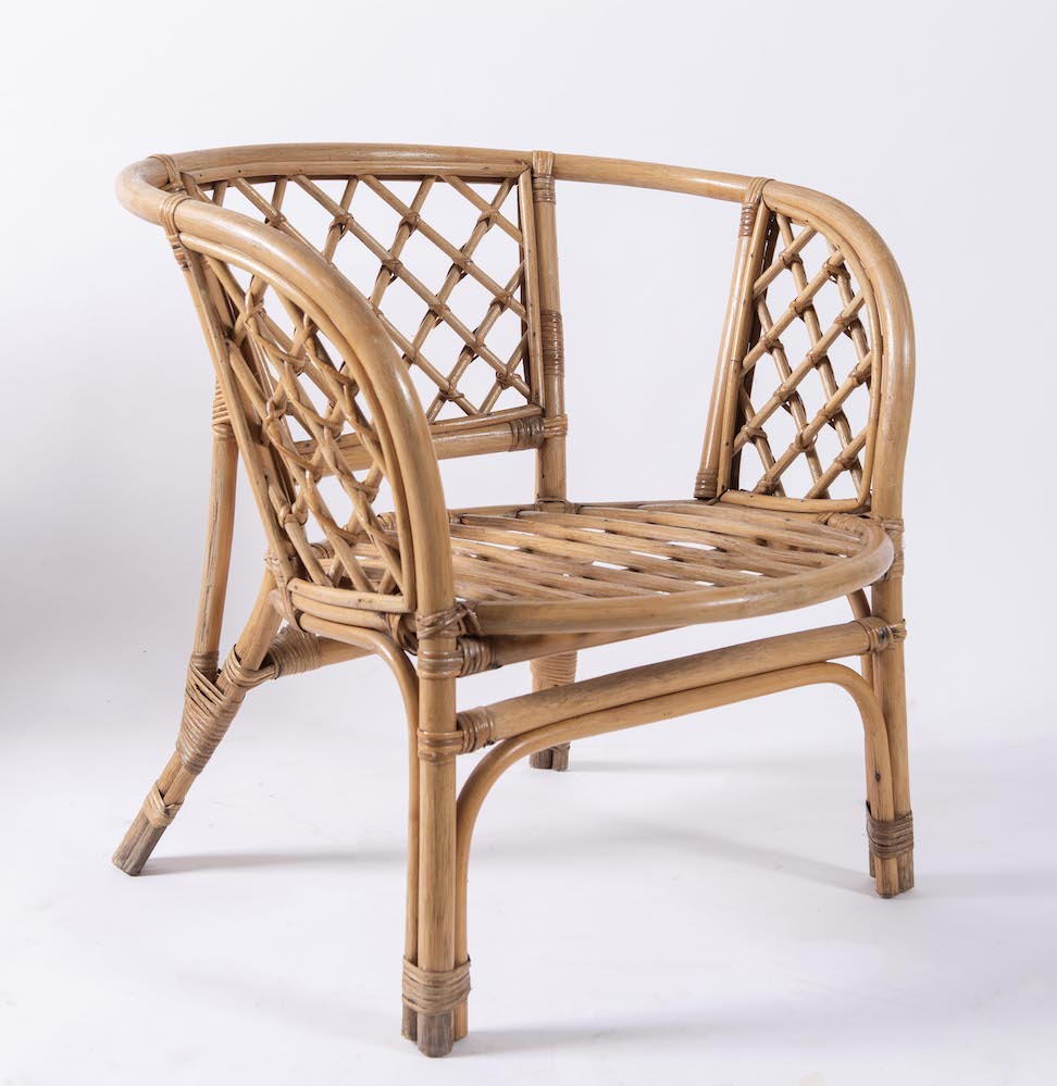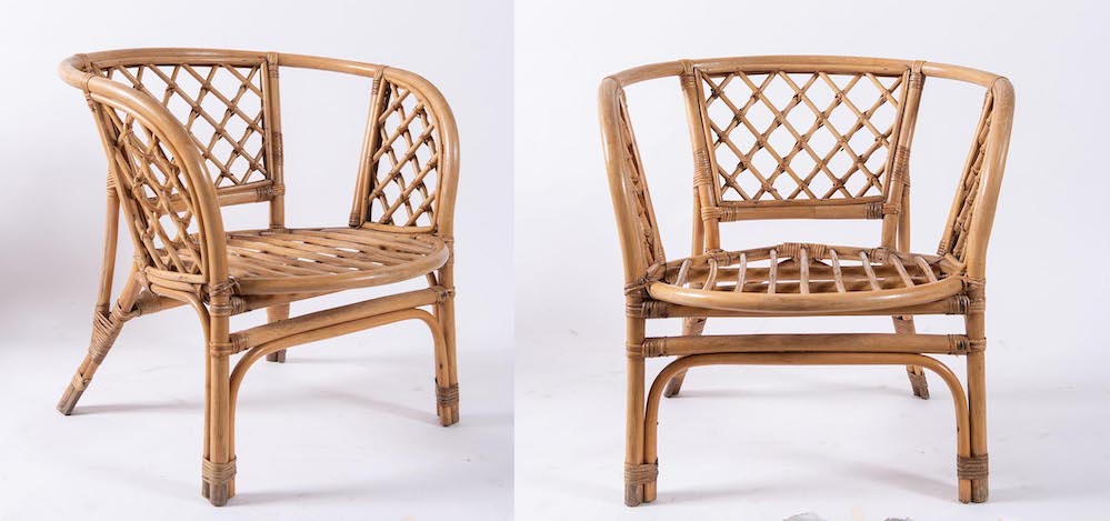 Coppia di sedie in vimini e bamboo. Prod. Italia, 1970 ca. Cadauna di cm 72x70x66.