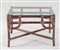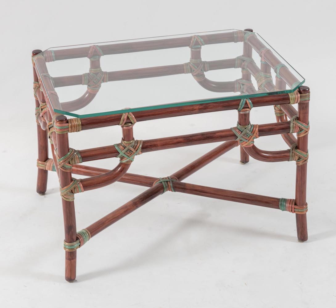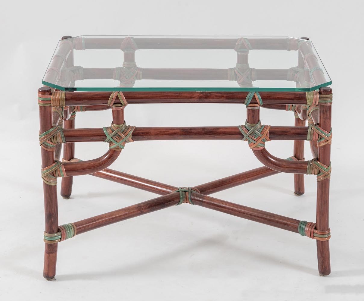 Tavolino da caffè in bamboo e legature in cuoio con piano in vetro. Prod. Italia, 1980 ca. Cm 41x43,5x59.